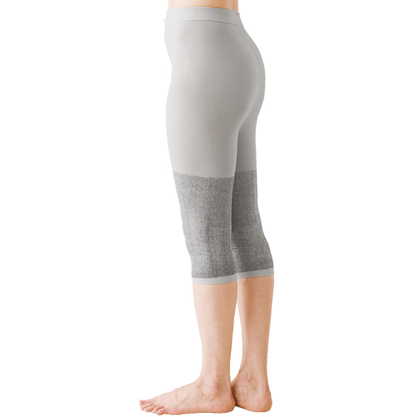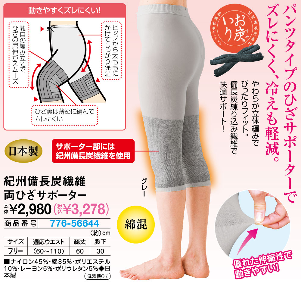 パンツタイプのひざサポーターでズレにくく、冷えも軽減! やわらか立体編みでぴったりフィット。 備長炭練り込み繊維で快適サポート! 優れた伸縮性で動きやすい! サポーター部には紀州備長炭繊維を使用 【動きやすくズレにくい!】 ヒップから太ももにかけてしっかり保温 ひざ裏は薄めに編んでムレにくい 独自の編み立てでひざの屈伸がスムーズ ●綿混