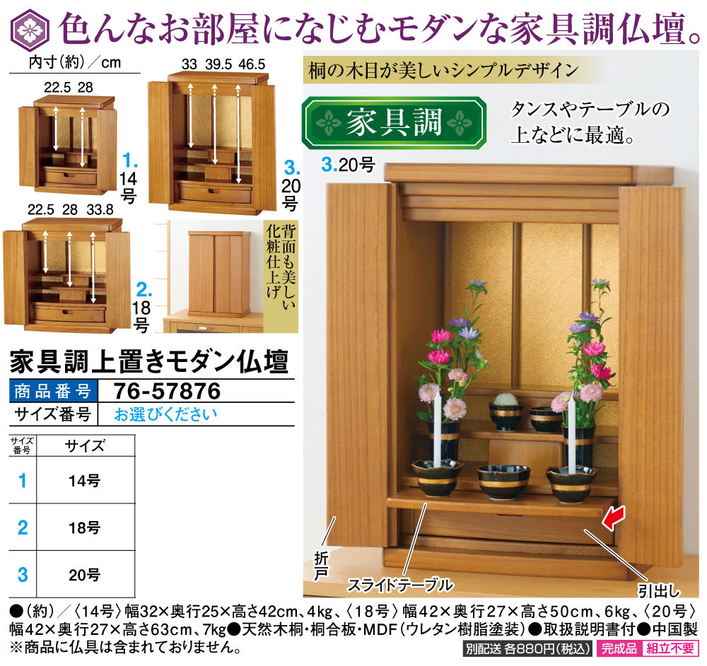 ●サイズ(約) 【14号】 ・天板:幅32.2x奥行25.2x高さ2.5cm ・扉:幅15.6x奥行36.9x高さ1.5/2.0cm ・幕板:4.5cm ・幕板開き時:全体幅45.5cm(全開時59cm) ・スライドトレー:幅26.2x奥行15(有効12)x高さ1.2cm ・引出し:内寸:幅22.7x奥行16.8x高さ3.7cm <収納内寸詳細> 上段:幅28.0×奥行9.0×高さ22.5(間口18.0)cm 下段:幅28.0×奥行10.0×高さ28.0(間口23.0)cm 【18号】 ・天板:幅42.2x奥行27.2x高さ3.1cm ・扉:幅20.5x奥行43.9x高さ1.5/2.0cm ・幕板:5cm ・スライドトレー:幅35.5x奥行15.6(有効12)x高さ1.5cm ・引出し:内寸:幅22.7x奥行16.8x高さ3.7cm <収納内寸詳細> 上段:幅38.0×奥行7.5×高さ22.5(間口17.5)cm 中段:幅38.0×奥行6.0×高さ28.0(間口23.0)cm 下段:幅38.0×奥行7.0×高さ33.8(間口29.0)cm 【20号】 ・天板:幅42.2x奥行27.2x高さ3.1cm ・扉:幅20.5x奥行56.8x高さ1.5/2.0cm ・幕板:6cm ・スライドトレー:幅35.5x奥行16(有効12.4)x高さ1.5cm ・引出し:内寸:幅31x奥行16.8x高さ4.7cm <収納内寸詳細> 上段:幅38.0×奥行8.0×高さ33.0(間口27.0)cm 中段:幅38.0×奥行6.5×高さ39.5(間口33.5)cm 下段:幅38.0×奥行7.5×高さ46.5(間口40.0)cm ●天然木桐・桐合板・プリント紙化粧繊維板(背面のみ) ●取扱説明書付 ●中国製