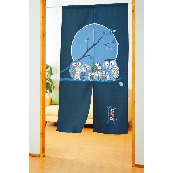 お部屋に合わせて選べるのれん! 【青ふくろう:約85×150cm】 福を呼ぶ七羽の「ふくろう」と仕事運を呼び込む紺色を合わせた縁起柄。