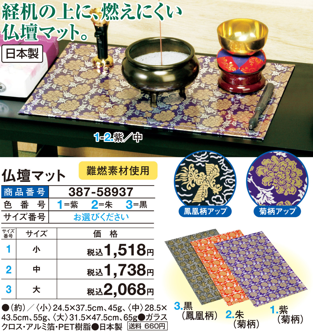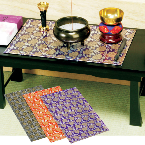ローソク、線香が落ちても焦げにくく、燃えにくい仏壇マット。 難燃素材・・・ガラスクロスとアルミ箔の特殊素材 華やかな柄で仏前を格調高く演出します ◎日本製
