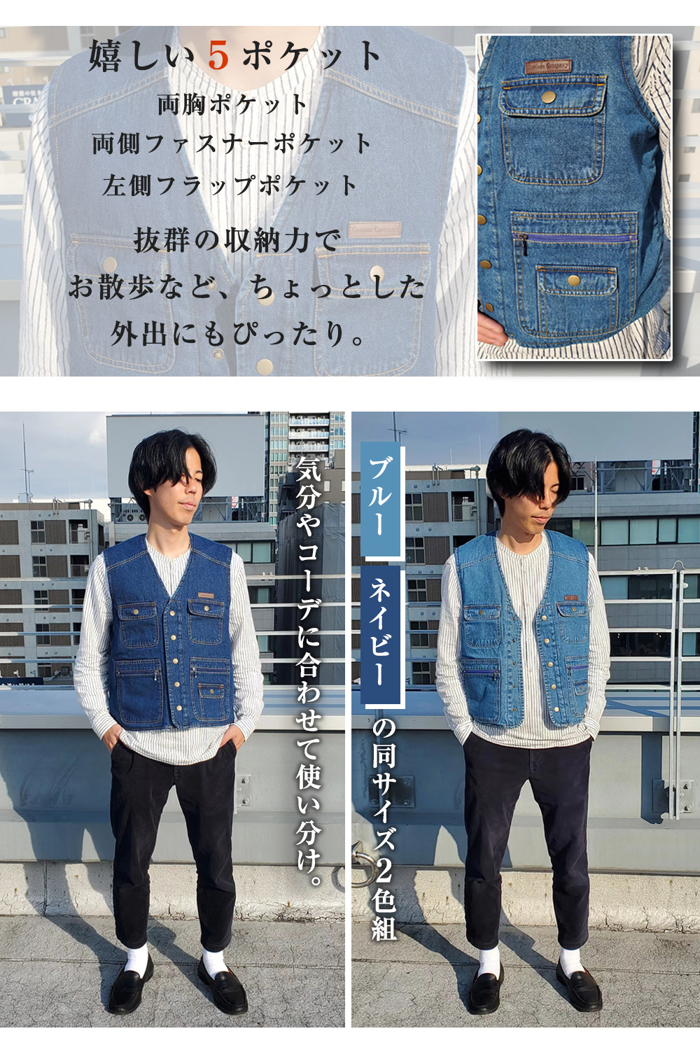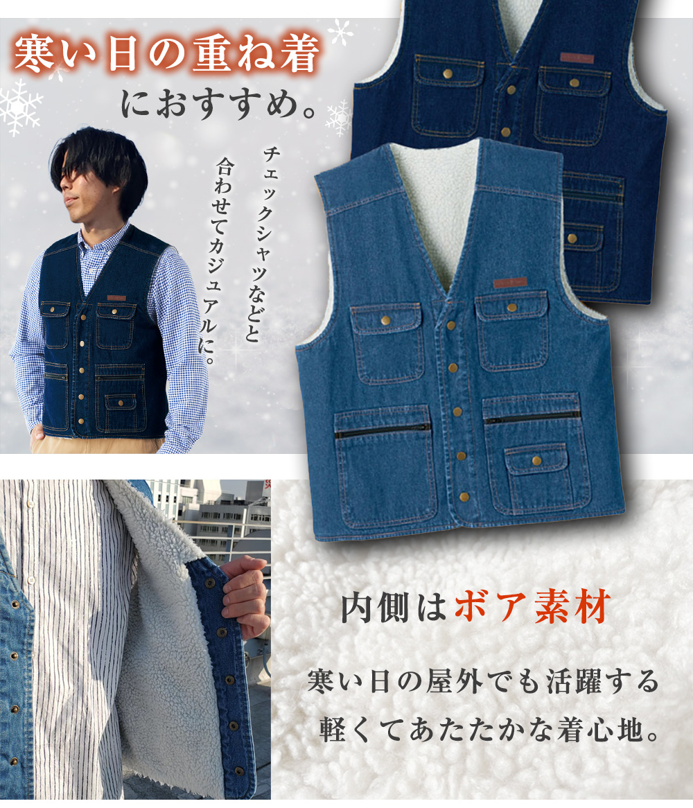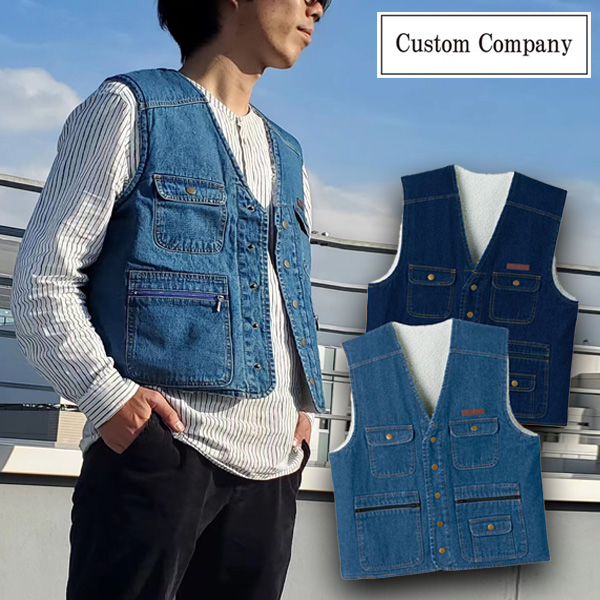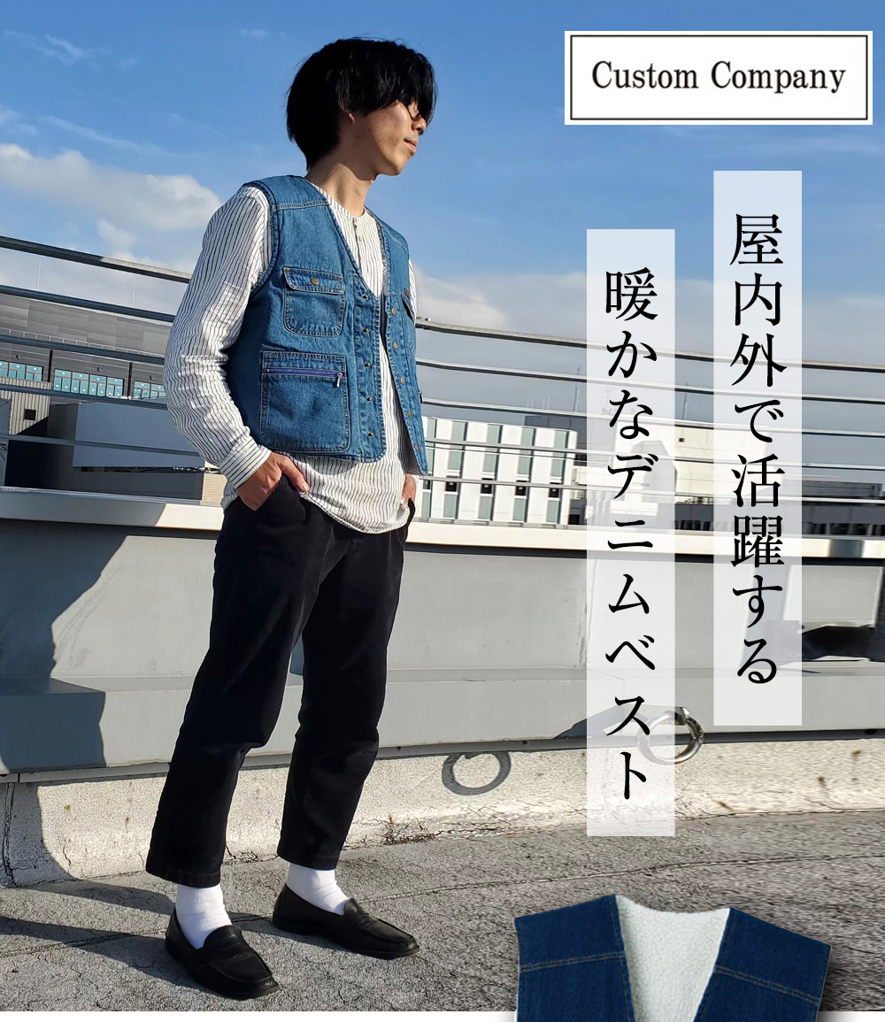 【Custom Company】寒い日の重ね着におすすめ! ~屋内外で活躍するデニムベスト~ チェックシャツなどと合わせてカジュアルに! 5ポケットで収納力も抜群。 ◎はぴねすくらぶオリジナル ◎同サイズ2色セット ◎綿100%(表地) 軽くて暖かな着心地。 内側はあったかボア。