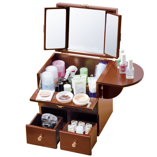 コンパクトに持ち運べて大容量! 三面鏡とミニテーブルが付いた使いやすいメイクボックス。 サッと開いて好きな場所でいつでもメイクOK! 取っ手付で持ち運び便利 ●髪染めもラクラク! ●便利な三面鏡 髪染めやヘアアレンジがラクにできて便利。左右の鏡は内側にすっきり収納できます。 ●小物置きに便利! ●バタフライ式ミニテーブル 使わない時はコンパクトにたためます。 ●分けられて便利 ●中仕切り付 奥には背の高いボトル、手前は背の低いクリームなどを分けて整理。 ●取出しやすい ●可動式前面扉 扉を手前に倒すと、取出しやすくなります。さらにミニテーブルとしても使用できます。 ●コンパクトなのに大容量 ●選べる3色 ●メイクボックス