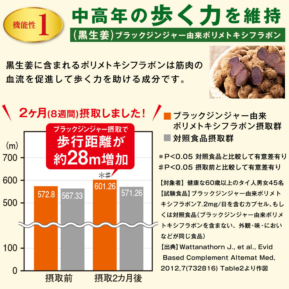 (黒生姜)ブラックジンジャー由来ポリメトキシフラボン 黒生姜に含まれるポリメトキシフラボンは筋肉の血流を促進して歩く力を助ける成分です。