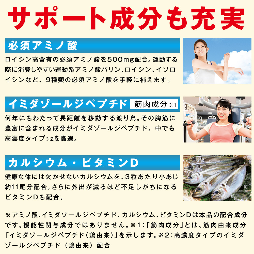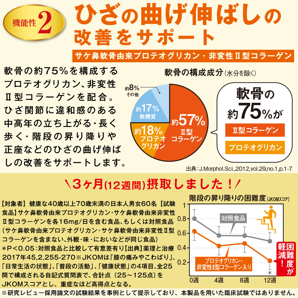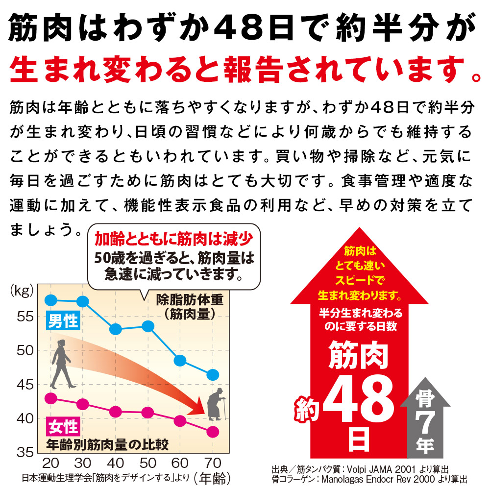 サケ鼻軟骨由来プロテオグリカン・非変性Ⅱ型コラーゲン 軟骨の約75%を構成するプロテオグリカン、非変性Ⅱ型コラーゲンを配合。 ひざ関節に違和感のある中高年の立ち上がる・長く歩く・階段の昇り降りや正座などのひざの曲げ伸ばしの改善をサポートします。 筋肉はわずか48日で約半分が生まれ変わると報告されています。 筋肉は年齢とともに落ちやすくなりますが、わずか48日で約半分が生まれ変わり、日頃の習慣などにより何歳からでも維持することができるともいわれています。 買い物や掃除など、元気に毎日を過ごすために筋肉はとても大切です。 食事管理や適度な運動に加えて、機能性表示食品の利用など、早めの対策を立てましょう。