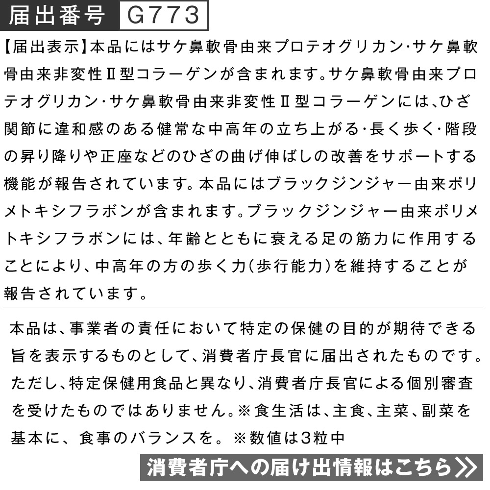 ●内容量/1パック:32.6g(1粒重量351mg×93粒)<粒タイプ(31日分)> ●特定原材料等 : さけ、鶏肉 ●一日摂取目安量/3粒 ●原材料名/ブラックジンジャー抽出物(ブラックジンジャーエキス、デキストリン)(国内製造)、サケ鼻軟骨抽出物(プロテオグリカン・非変性Ⅱ型コラーゲン含有)、でんぷん、チキンエキス(イミダゾールジペプチド含有)、エイ軟骨抽出物(低分子コンドロイチン含有)/焼成カルシウム、L-ロイシン、L-リジン塩酸塩、HPC、Lーバリン、L-フェニルアラニン、L-イソロイシン、ステアリン酸カルシウム、L-トレオニン、L-メチオニン、L-ヒスチジン、微粒二酸化ケイ素、加工デンプン、L-トリプトファン、ビタミンB2、トウモロコシたん白、ビタミンD、(一部に鶏肉・さけを含む) ●栄養成分表示(一日摂取目安量3粒1.05gあたり)/エネルギー:3.5kcal、たんぱく質:0.44g、脂質:0.05g、炭水化物:0.3g、食塩相当量:0.009g、カルシウム:70mg、ビタミンD:10.0μg ●機能性関与成分(一日摂取目安量3粒1.05gあたり)/サケ鼻軟骨由来プロテオグリカン:16mg、サケ鼻軟骨由来非変性Ⅱ型コラーゲン:16mg、ブラックジンジャー由来ポリメトキシフラボン:7.2mg ●その他の成分(一日摂取目安量3粒1.05gあたり)/アミノ酸:500mg、イミダゾールジペプチド:10mg、低分子コンドロイチン:2.5mg 【保存方法】高温・多湿、直射日光を避け、なるべく涼しい所に保存してください。 【保存上の注意】乳幼児の手の届かない所に保存してください。品質保持のため開封後はチャックをしっかり閉め、なるべくお早めにお召し上がりください。 【摂取の方法】一日3粒を目安に、水またはお湯などでお召し上がりください。