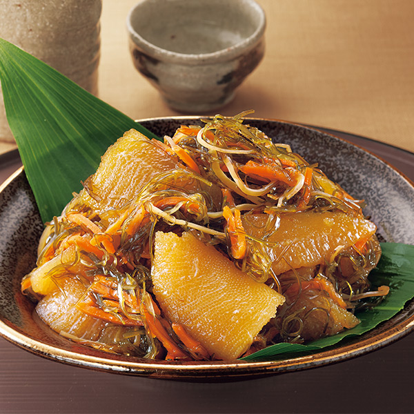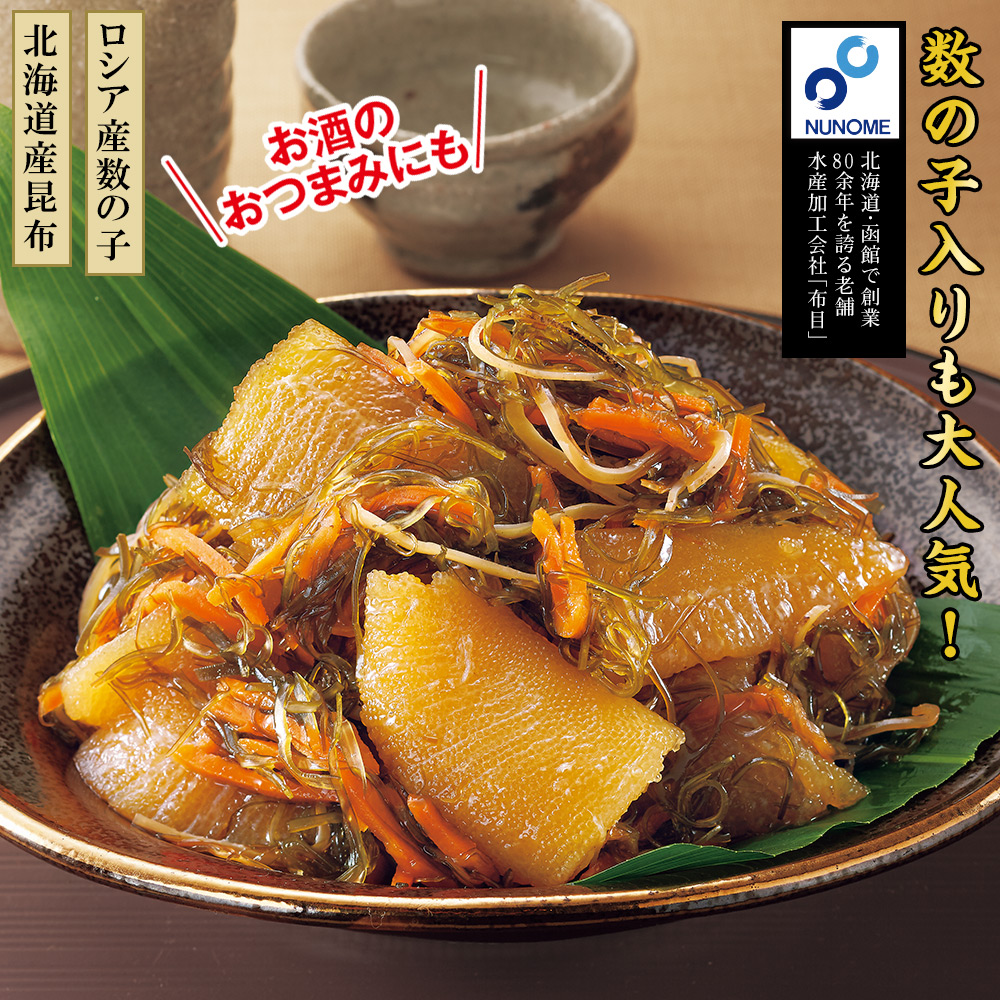 ●原材料/数の子(ロシア産)、昆布(北海道産)、しょうゆ、にんじん(国産)、砂糖混合ぶどう糖果糖液糖、水あめ、スルメイカ、醸造調味料、砂糖、みりん、かつおエキス、還元水あめ、食塩、かつお節粉末、酵母エキス/トレハロース、ソルビット、酒精、調味料(アミノ酸等)、pH調整剤、増粘多糖類、酵素