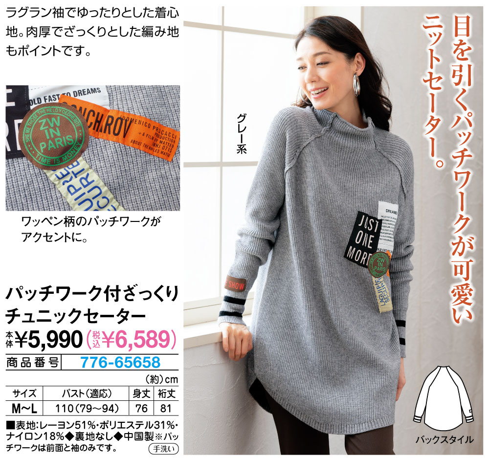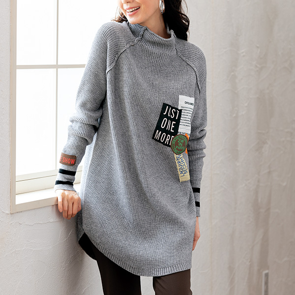 目を引くパッチワークが可愛いニットセーター! ラグラン袖でゆったりとした着心地。 肉厚でざっくりとした編み地もポイントです。 ワッペン柄のパッチワークがアクセントに。