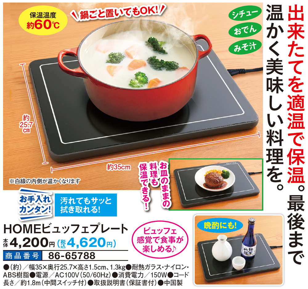 出来たてを適温で保温。最後まで温かく美味しい料理を! \鍋ごと置いてもOK!/ ●保温温度 約60度 ●シチュー ●おでん ●みそ汁 お皿のまま保温できる! ビュッフェ感覚で食事が楽しめる♪ 晩酌にも!」 \お手入れカンタン!/ 汚れてもサッと拭き取れる!