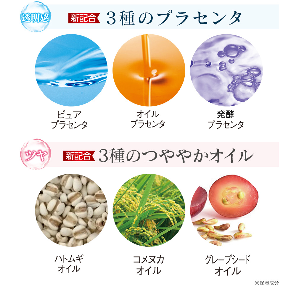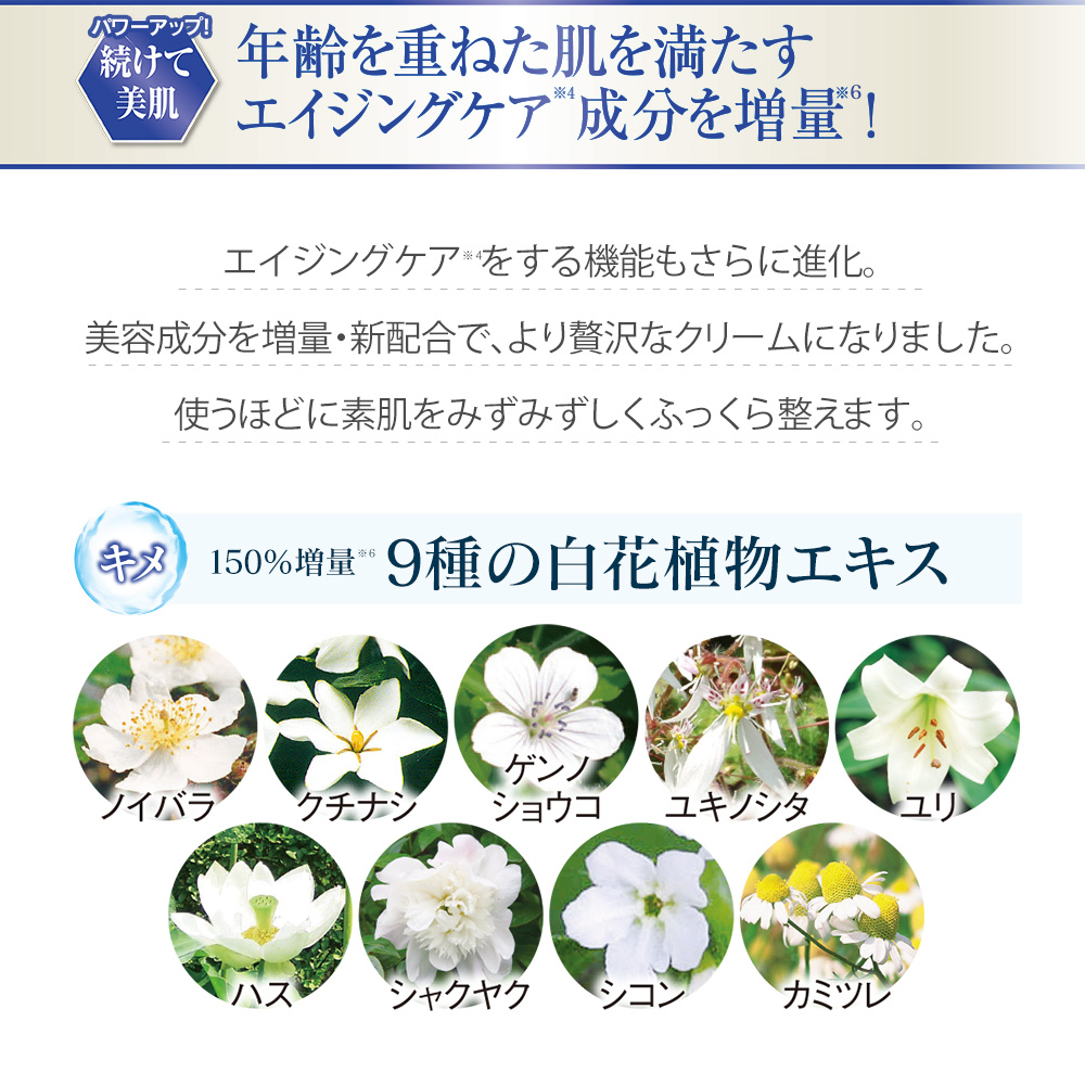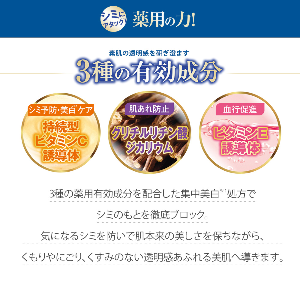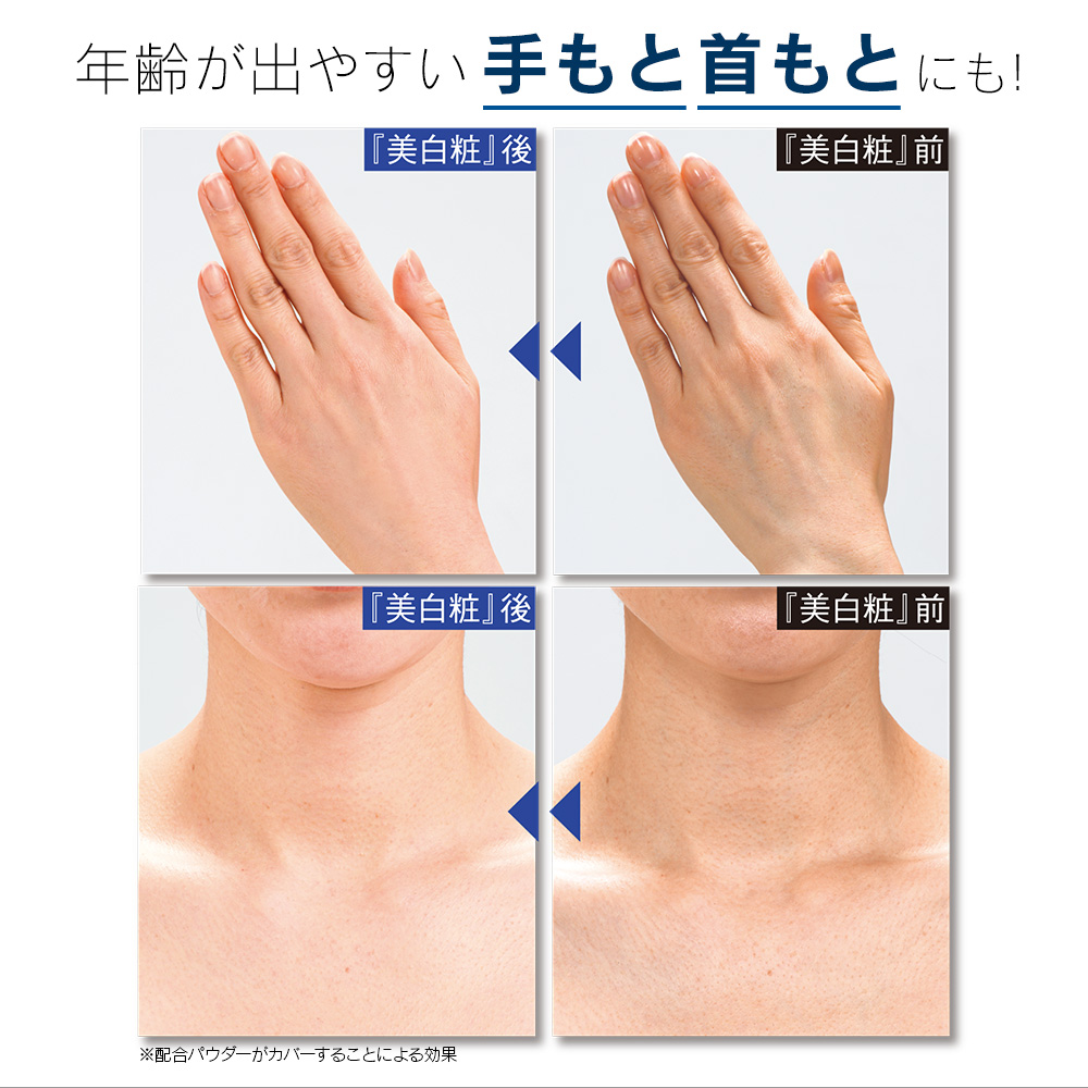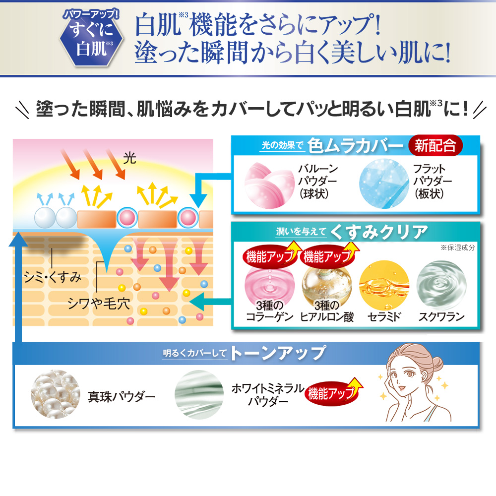 ※1メラニンの生成を抑え、シミ、ソバカスを防ぎます。※2乾燥による。※3配合パウダーがカバーすることによる効果。※4年齢に応じた、ハリやうるおいのお手入れ。※5合成香料不使用・合成着色料(タール色素)不使用・ノンアルコール・無鉱物油・パラベン不使用。※6従来商品比較。