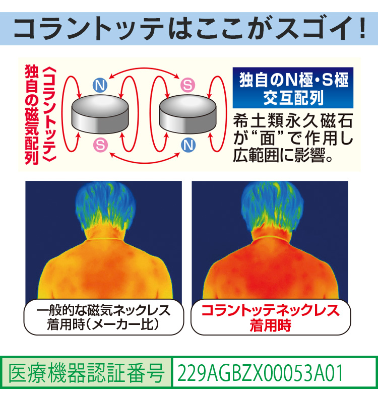 独自の磁気配列で血行を改善し筋肉のコリを緩和 柔らかなカーブを描く鏡面仕上げのトップデザイン。 ●日本製 ●水に強いシリコン素材 <マグネット式 フロントジョイント> トップジョイントの素材は丈夫で錆びにくい高品位ステンレスを使用。 ・ジャケットなど様々なコーディネートのアクセントになるデザイン ・細めのループで軽い着け心地 【医療機器認証番号】229AGBZX00053A01