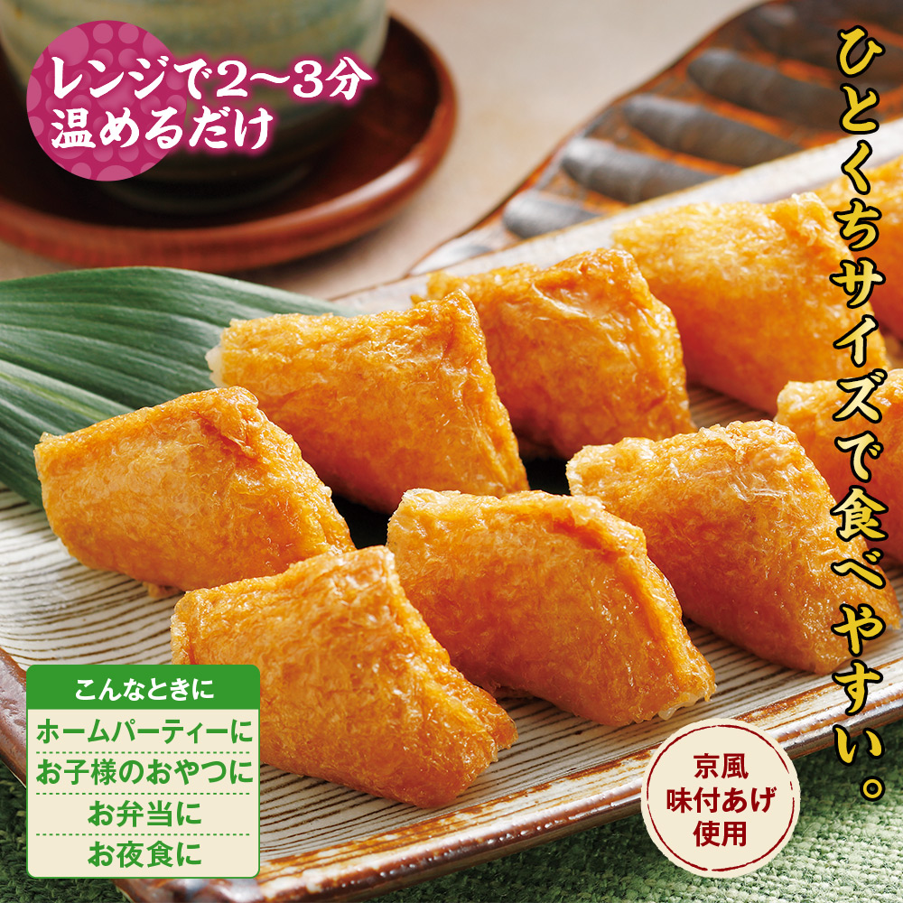 レンジで2~3分温めるだけ。 京風の上品な甘さのひとくちいなりです。 製法にこだわって優しい口当たりを追求した油揚げと柔らかい酢飯を使い、手作業で丁寧につくりました。 京風味付あげ使用 こんなときに ・ホームパーティーに ・お子様のおやつに ・お弁当に ・お夜食に