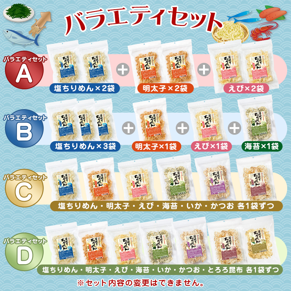 ●セット内容/1袋あたり15g【塩ちりめん×2袋】 【辛子明太子×2袋】【えび×2袋】
