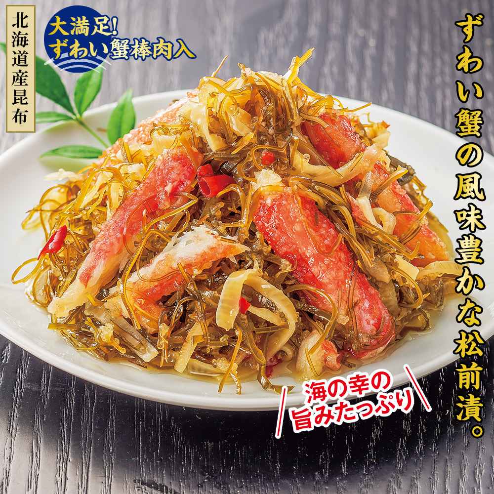 【北海道産昆布】 大満足!ずわい蟹棒肉入。 海の幸の旨みたっぷり。 昭和57年創業、北海道の老舗が作る味わい深い贅沢な松前漬です。 ずわい蟹をはじめ数の子や昆布の豊かな風味をお楽しみください。