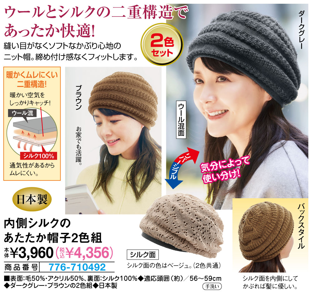 ■表面:毛50%・アクリル50%、裏面:シルク100% ◆適応サイズ(約) /頭囲56~59cm ◆ダークグレー・ブラウンの2色組 ◆日本製