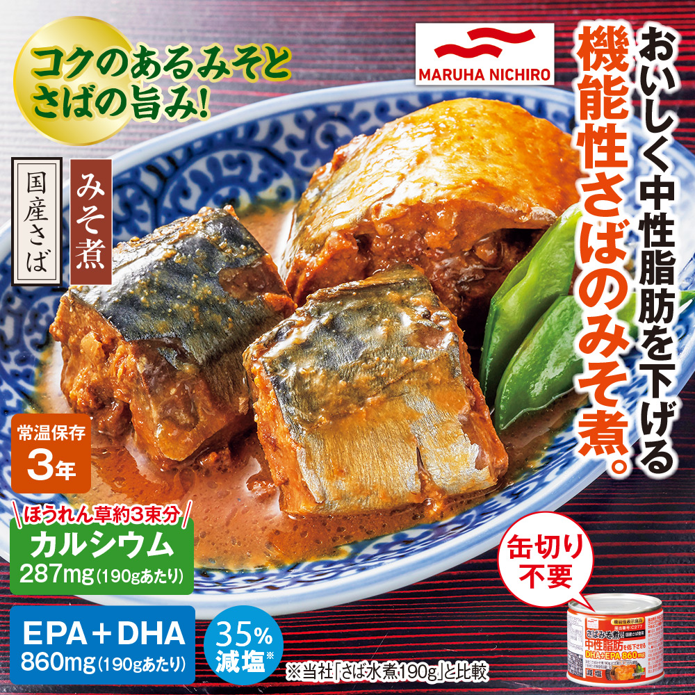 国産さば使用 <水煮> 中性脂肪を低下させるDHAとEPAを含有。 素材の味を活かしたおいしさです。 ほうれん草約3束分 カルシウム286mg(190gあたり) EPA+ DHA860mg(190gあたり) 25%減塩※ ※当社「さば水煮190g」と比較 常温保存3年 缶切り不要 <みそ煮> 中性脂肪を低下させるDHAとEPAを含有。 コクと旨みのある、みその味わいが食欲をそそります。 ほうれん草約3束分 カルシウム287mg(190gあたり) EPA+ DHA860mg(190gあたり) 35%減塩※ ※当社「さばみそ煮190g」と比較 常温保存3年 缶切り不要