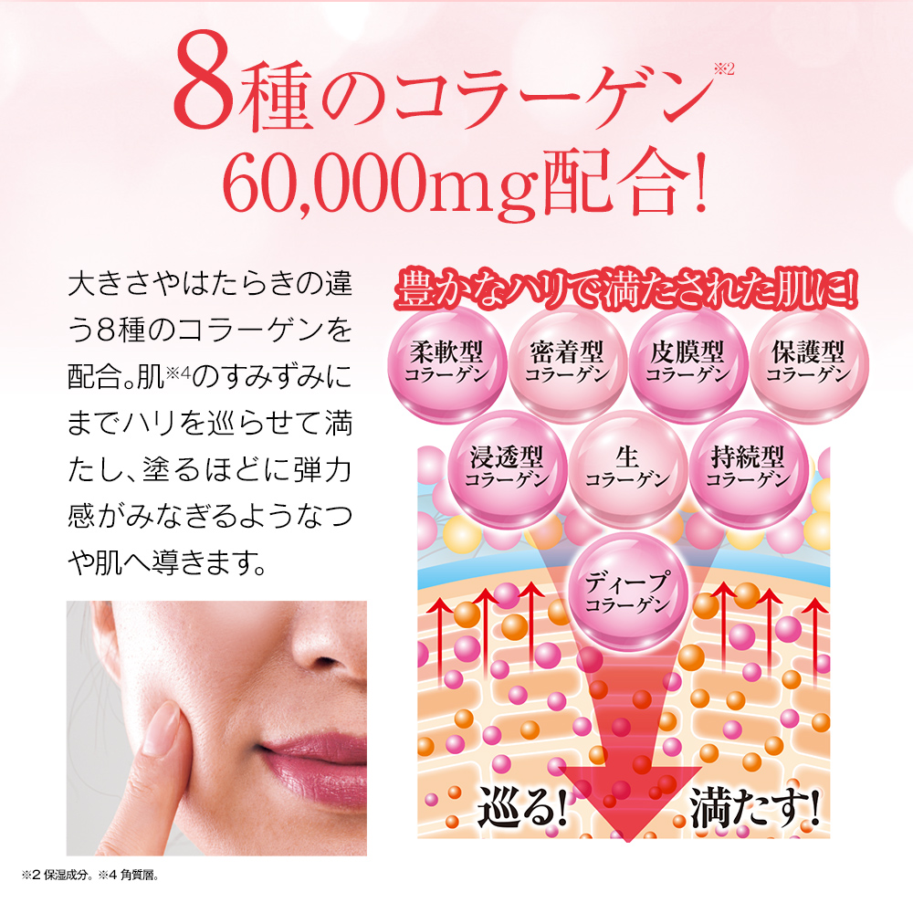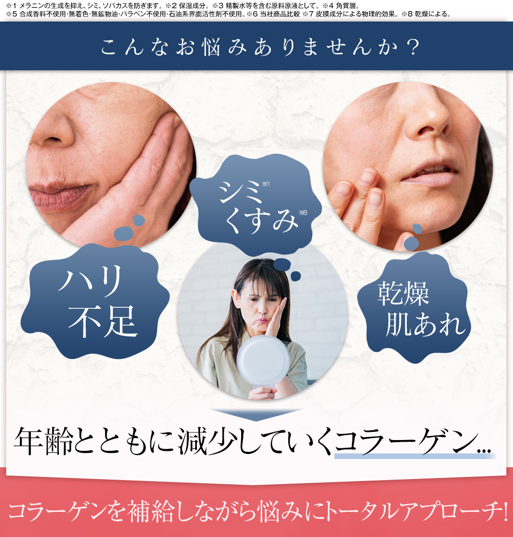 コラーゲンを補給しながら悩みにアプローチ! ・シミ(※1)・くすみ(※8)・ハリ不足・乾燥・肌あれ