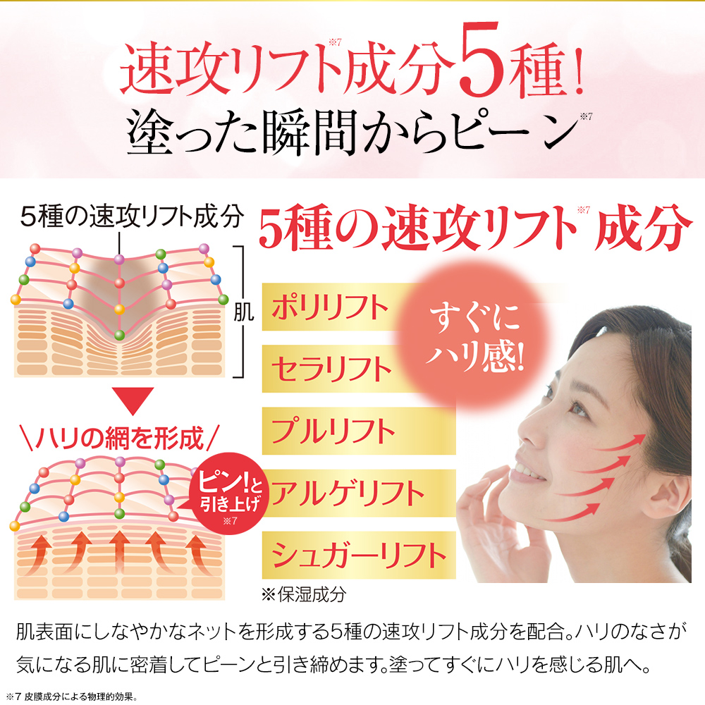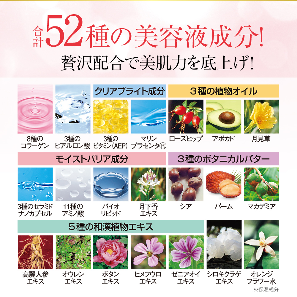 ※1 メラニンの生成を抑え、シミ、ソバカスを防ぎます。 ※2 保湿成分。 ※3 精製水等を含む原料原液として。 ※4 角質層。 ※5 合成香料不使用・無着色・無鉱物油・パラベン不使用・石油系界面活性剤不使用。 ※6 当社商品比較 ※7 皮膜成分による物理的効果。 ※8 乾燥による。 *パッチテスト済み(すべての方に皮膚刺激が起きないというわけではありません) ※イラスト、成分の写真はイメージです。