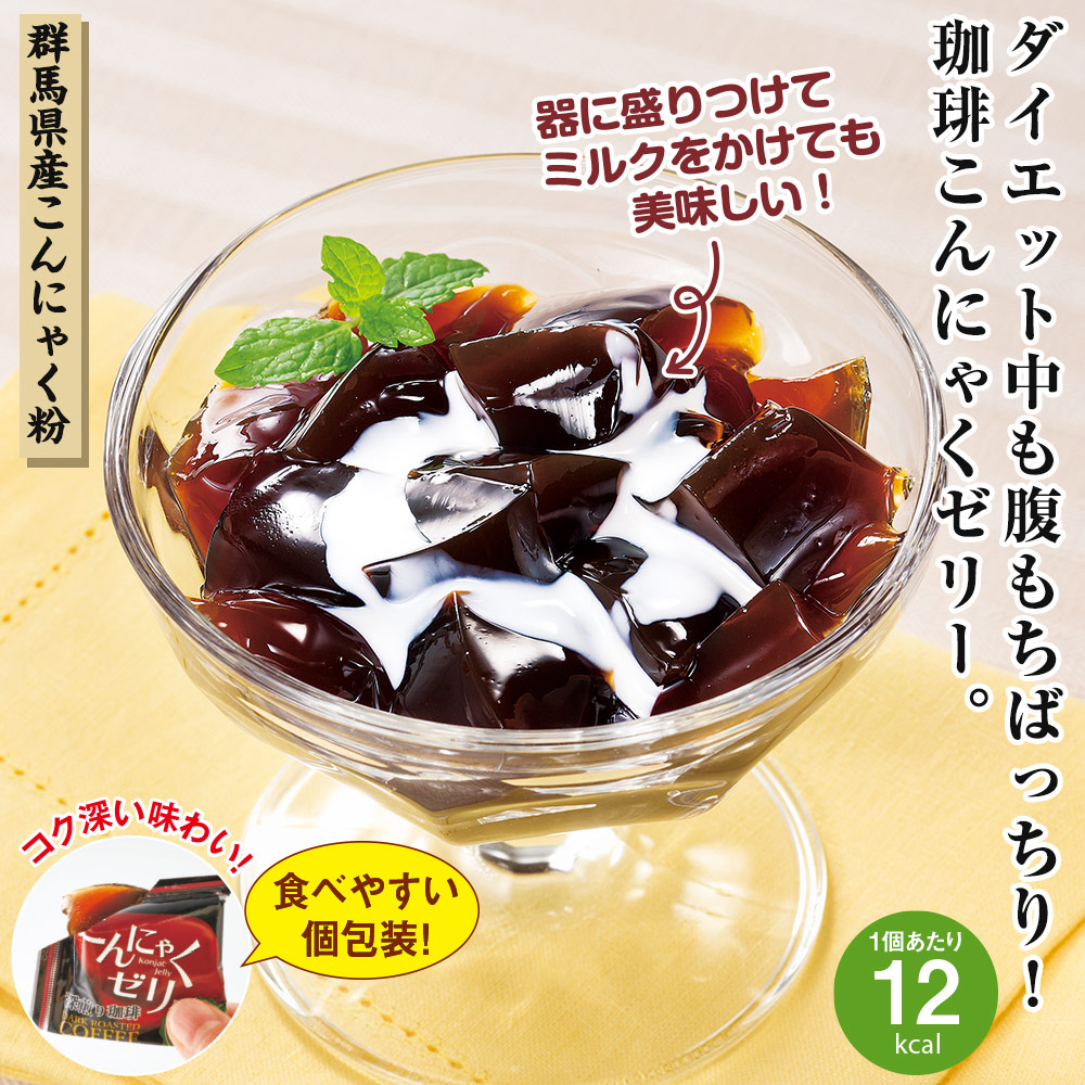 【群馬県産こんにゃく粉】 本格深煎り珈琲を使用したコク深い味わい。 甘さがあって腹もちばっちり!ダイエット中のおやつにどうぞ! 器に盛りつけてミルクをかけても美味しい! 1個あたり12kcal
