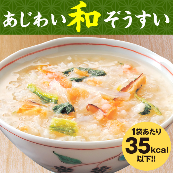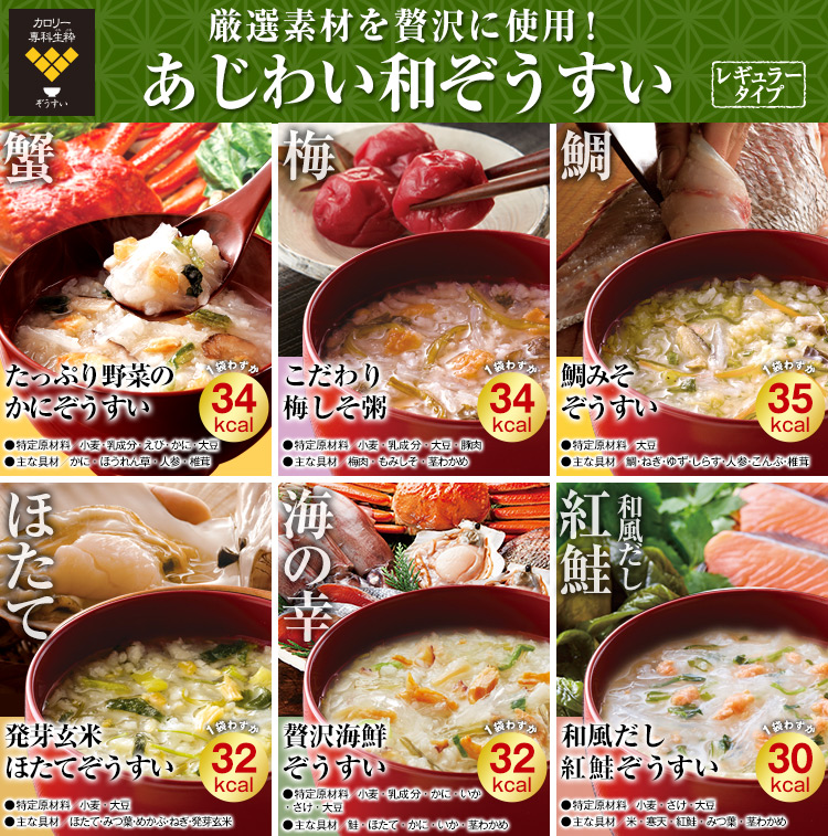 あじわい和ぞうすい6種類の味 ●たっぷり野菜のかにぞうすい [51177] ずわいがにとたっぷりの野菜を使って、やさしい味わいに仕上げました。 (1袋/34kcal) ●贅沢海鮮ぞうすい [52135] 「鮭」「ほたて」「かに」「いか」4つの豪華な海の幸を一杯で楽しめます。 (1袋/32kcal) ●発芽玄米ほたてぞうすい<みつ葉入り> [52388] 贅沢な海の幸、ほたての旨みがたっぷり。みつ葉も入って、香り豊かな味わいです。 (1袋/32kcal) ●和風だし紅鮭ぞうすい[98242] 滋味あふれる鰹・昆布の合わせだしと、脂ののった遡上前の紅鮭の旨みが絶妙にマッチ! (1袋/30kcal) ●こだわり梅しそ粥 [51176] 紀州梅に国産もみしそ。味わい深いおいしさが、幅広い世代に好評です。 (1袋/34kcal) ●鯛みそぞうすい [51582] 鯛やしらすなど海の幸と白味噌がマッチ。上品なおいしさをご堪能ください。 (1袋/35kcal)