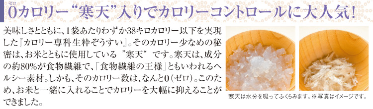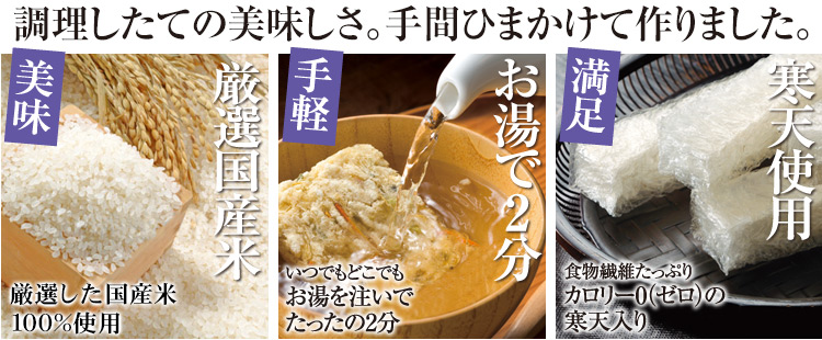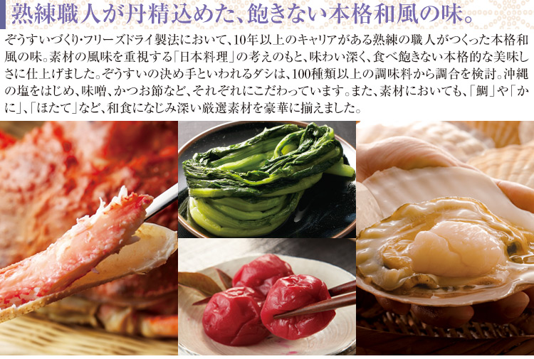 1袋あたり35kcal以下! 熟練の職人がつくった、飽きない本格和風の味。 ぞうすいづくり・フリーズドライ製法において、10年以上のキャリアがある熟練の職人がつくった本格和風の味。 素材の風味を重視する「日本料理」の考えのもと、味わい深く、食べ飽きない本格的な美味しさに仕上げました。 ■ダシからこだわり豪華素材を風味豊かに。 ぞうすいの決め手といわれるダシは、100種類以上の調味料から調合を検討。沖縄の塩をはじめ、味噌、かつお節など、それぞれにこだわっています。 また、素材においても「鯛」や「かに」、「ほたて」など、和食になじみ深い厳選素材を豪華に揃えました。 ○国内製造フリーズ食品