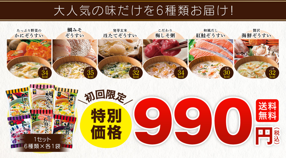 初回限定価格¥990(税込)はカートに入れると反映されます。 2回目以降の方は通常価格でのご案内となります。 初めてのご注文でも、同時に2点以上ご注文された場合は初回限定価格は適用外です。 初回限定特別価格の商品は1世帯につき1回限りのため、お届け先はご自宅のみとさせていただきます。 <ご購入に関するお願いとご注意> 「カロリー専科生粋あじわい和ぞうすい6日間チャレンジタイプ」はご注文後1週間~10日前後で郵便ポストに投函いたします。 お届け日時の指定はできかねますので、ご了承ください。※ポストのサイズなどによって、投函出来ない場合は手渡しでのお届けとなります。他の商品と同時にご注文の場合は、弊社が指定する配送業者でお届けいたします。その場合、郵便ポストに投函でのお届けはできかねます。