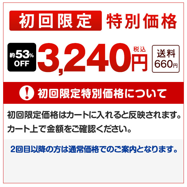 初回限定価格¥3,240(税込)はカートに入れると反映されます。 2回目以降の方は通常価格でのご案内となります。 2セット~送料無料! 初回限定特別価格の商品は1世帯につき1回3セット(6箱)限りのため、お届け先はご自宅のみとさせていただきます。