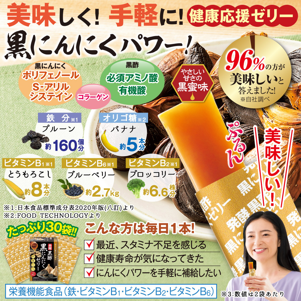黒にんにく・黒酢・黒糖 3つの黒の元気がぎゅっと詰まった健康応援ゼリー! ●スタミナ補給に栄養満点「黒にんにく」 約1カ月間発酵熟成させて栄養成分をパワーアップ! 元気の源ポリフェノールは生のにんにくの約10倍! アメリカ国立研究所が推奨するデザイナーズフードの中でもにんにくはNo.1 ●夏バテ予防に「玄米黒酢」 お酢の力でシャキッとハツラツ! ●熱中症予防にミネラルたっぷり「黒糖蜜」 ミネラル豊富な沖縄産の黒糖を使用 酷暑で不足しがちな水分とミネラル補給におすすめです。