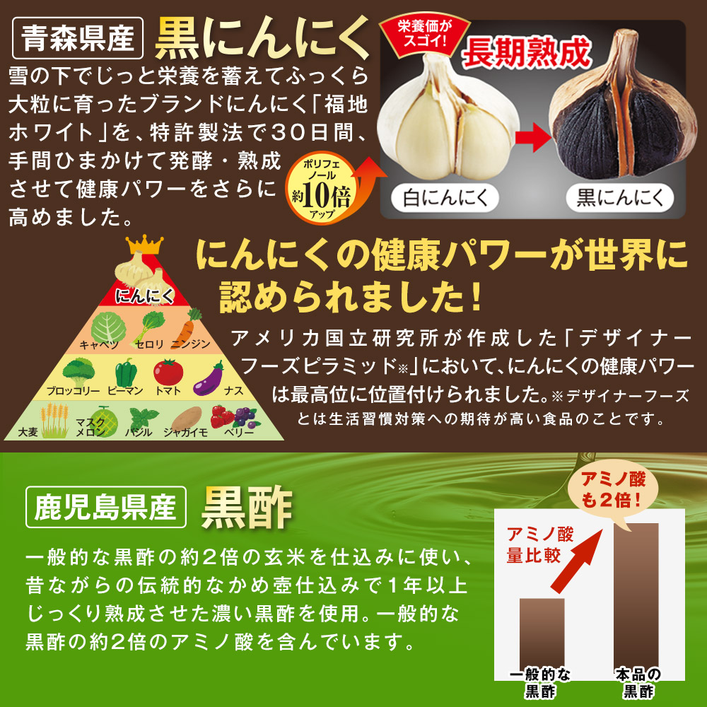 青森県産のブランドにんにく「福地ホワイト」を使用。 温度と湿度の管理だけでじっくり発酵・熟成させた完全自己発酵の黒にんにくは、注目の健康成分S-アリルシステインは約5倍、ポリフェノールは約10倍にもパワーアップします。