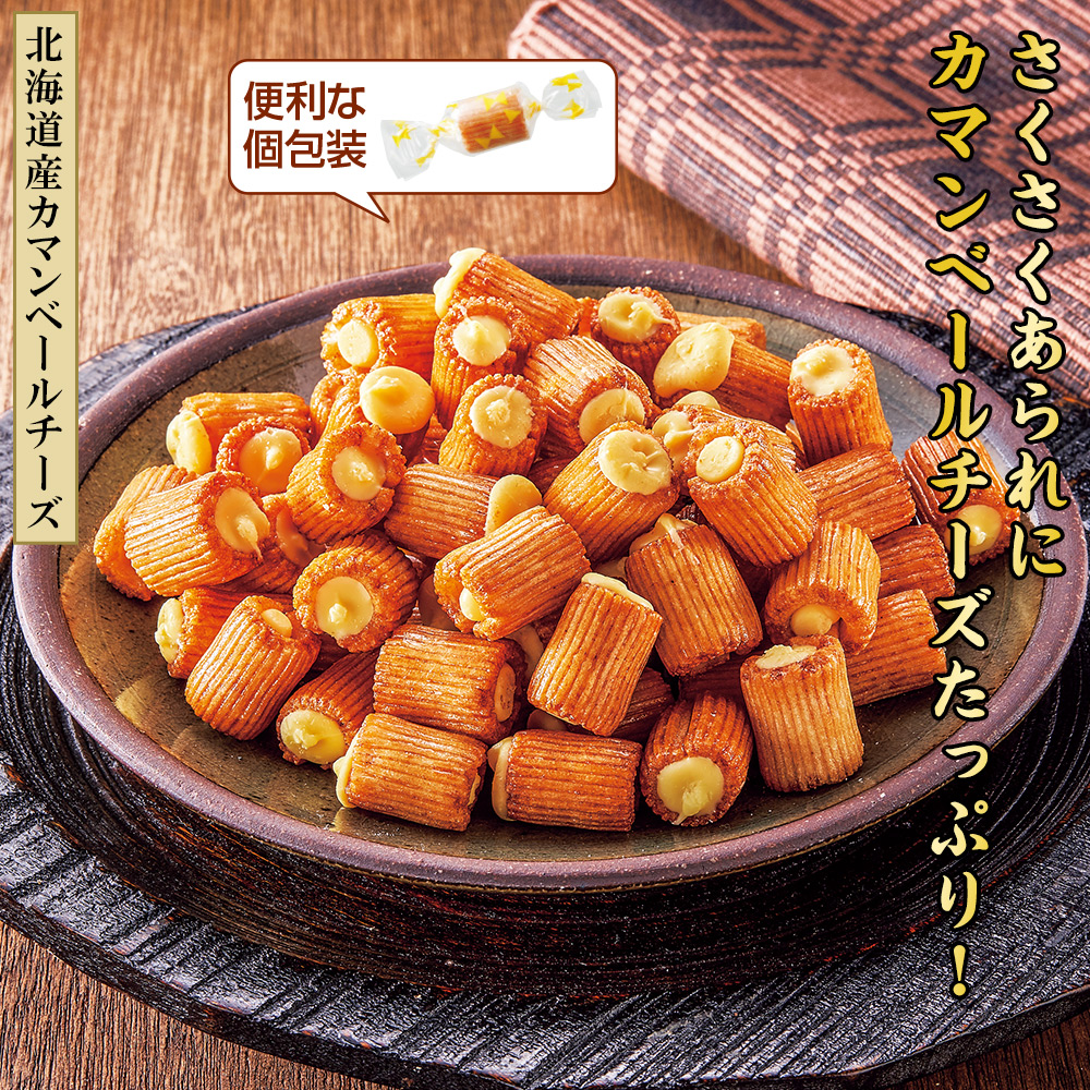 【北海道産カマンベールチーズ】 もち米を丹念に焼き上げた香ばしいあられに、カマンベールチーズをぎっしり詰めました。 やみつきになる味わいです。