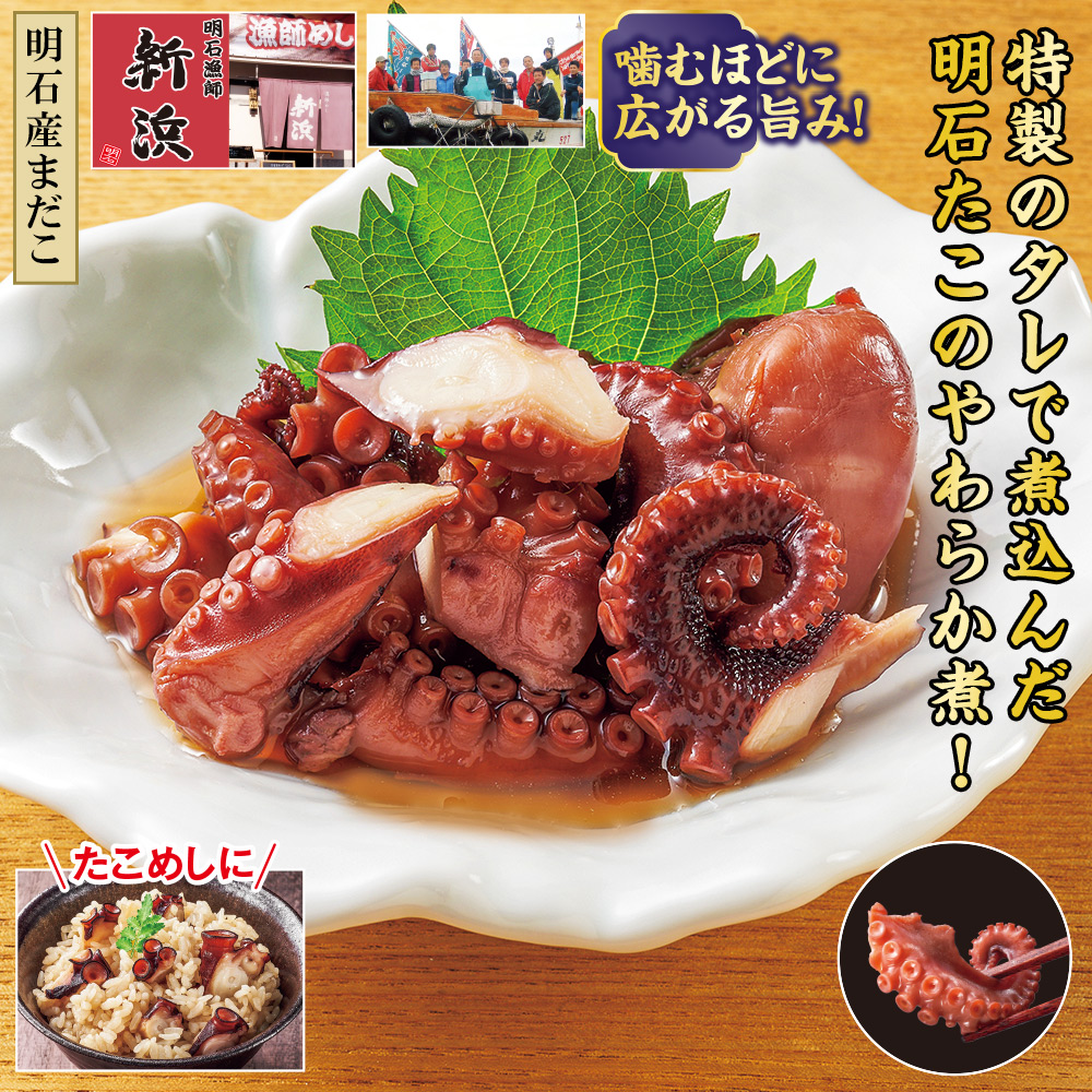 【明石産まだこ】 噛むほどに広がる旨み! 漁獲量日本一と称される明石たこを特製のタレに漬け込みじっくり煮込みました。 柔らかいのでお子さまからご年配の方までお楽しみいただけます。