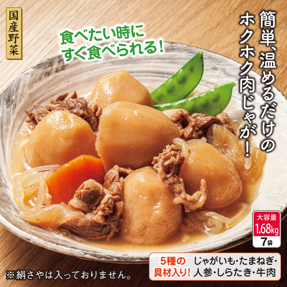 調理済だから温めるだけで、美味しくいただけます。 じゃがいもは崩れにくいメークインを使用。 やさしい味わいの肉じゃがです。 食べたい時にすぐ食べられる! 【5種の具材入り】 じゃがいも・たまねぎ・人参・しらたき・牛肉 ◎国産野菜
