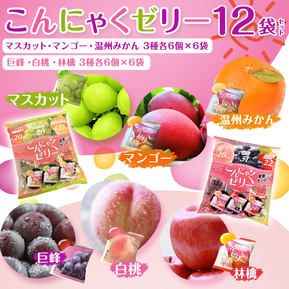 ●セット内容/(白桃、巨峰、林檎)3種各6個×6袋、(マンゴー、マスカット、温州みかん)3種各6個×6袋 ●賞味期限/製造日から常温1年 ●加工地/日本 ●原材料/<マスカット>砂糖混合ぶどう糖果糖液糖(国内製造)、シャインマスカットピューレ、こんにゃく粉/ゲル化剤(増粘多糖類)、酸味料、香料、甘味料(アセスルファムK、スクラロース) <巨峰>砂糖混合ぶどう糖果糖液糖(国内製造)、巨峰果汁、こんにゃく粉/酸味料、ゲル化剤(増粘多糖類)、香料、甘味料(アセスルファムK)<白桃>砂糖混合ぶどう糖果糖液糖(国内製造)、もも果汁、こんにゃく粉/酸味料、ゲル化剤(増粘多糖類)、香料、甘味料(アセスルファムK)<マンゴー>砂糖混合ぶどう糖果糖液糖(国内製造)、水溶性食物繊維、マンゴーピューレ、りんご濃縮果汁、こんにゃく粉/酸味料、ゲル化剤(増粘多糖類)、香料<温州みかん>砂糖混合ぶどう糖果糖液糖(国内製造)、温州みかん濃縮果汁、水溶性食物繊維、こんにゃく粉/ゲル化剤(増粘多糖類)、酸味料、香料、甘味料(アセスルファムK)<林檎>砂糖混合ぶどう糖果糖液糖(国内製造)、水溶性食物繊維、りんご濃縮果汁、こんにゃく粉/ゲル化剤(増粘多糖類)、酸味料、香料 ●特定原材料等 /<マスカット>なし<巨峰>なし<白桃>なし<マンゴー>なし<温州みかん>なし<林檎>なし