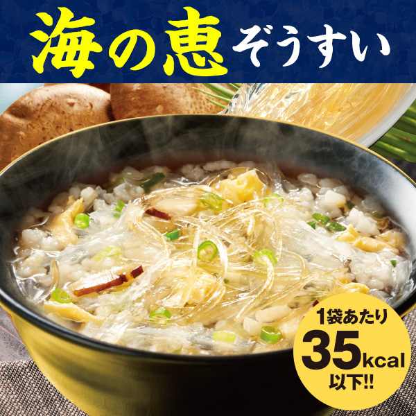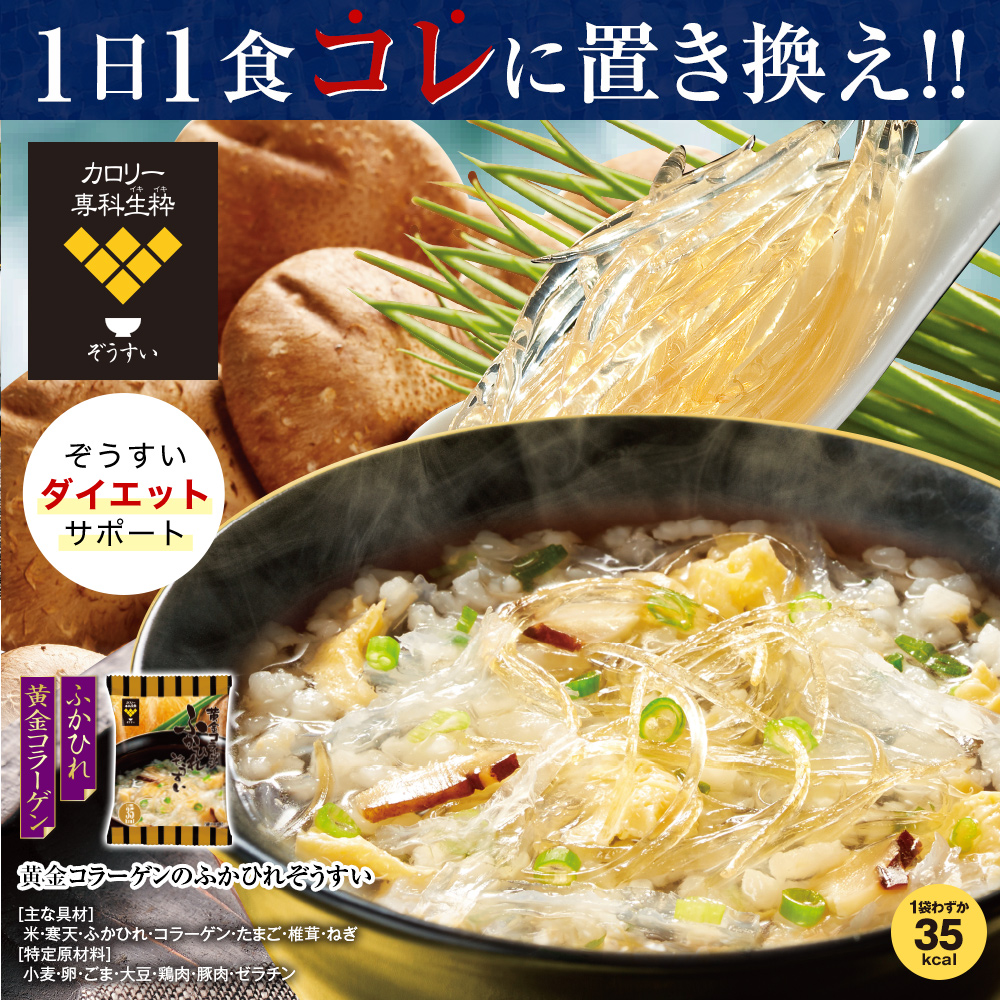 ●たっぷり野菜のかにぞうすい ずわいがにとたっぷりの野菜を使って、やさしい味わいに仕上げました。 (1袋/34kcal) ●鯛みそぞうすい 鯛やしらすなど海の幸と白味噌がマッチ。上品なおいしさをご堪能ください。 (1袋/35kcal) ●贅沢海鮮ぞうすい 「鮭」「ほたて」「かに」「いか」4つの豪華な海の幸を一杯で楽しめます。 (1袋/32kcal) ●釜揚げしらすかにぞうすい ふっくらと茹であげた釜揚げしらすと、紅い宝石とも呼ばれる紅ずわいがにの旨みが口いっぱいに広がります。 (1袋/34kcal) ●和風だし紅鮭ぞうすい 滋味あふれる鰹・昆布の合わせだしと、脂ののった遡上前の紅鮭の旨みが絶妙にマッチ! (1袋/30kcal) ●黄金コラーゲンふかひれぞうすい 高級感のある味わいとたっぷりのコラーゲン。プルプルと食感がよく、女性の方には特におすすめです。 (1袋/35kcal)