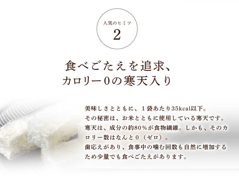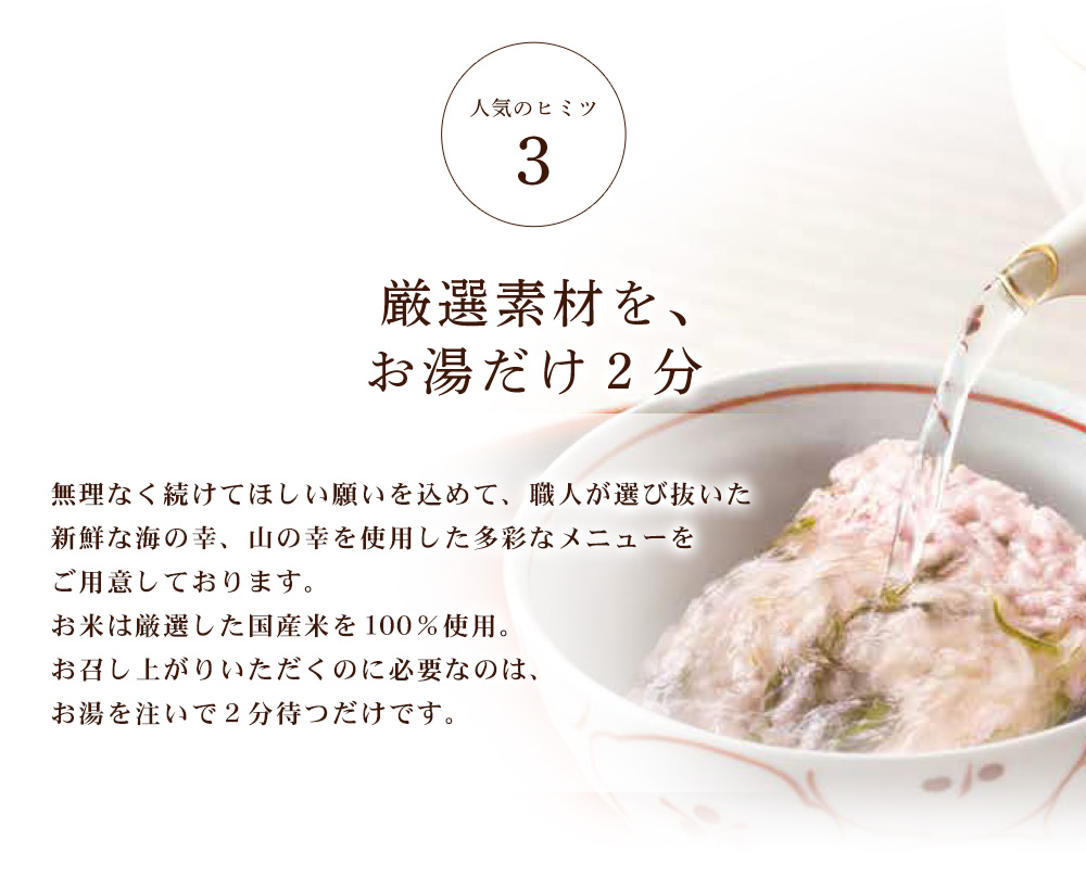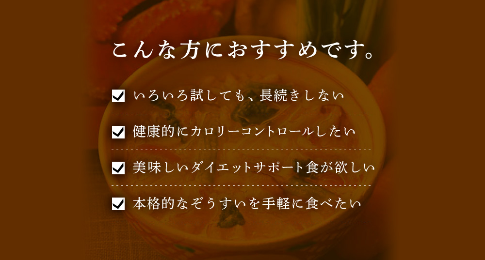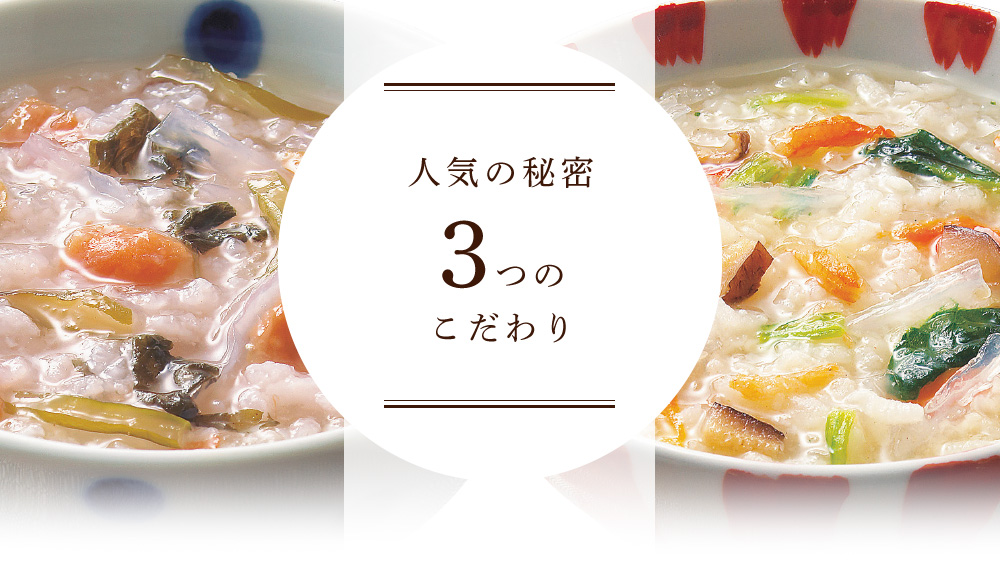 ●たっぷり野菜のかにぞうすい ずわいがにとたっぷりの野菜を使って、やさしい味わいに仕上げました。 (1袋/34kcal) ●鯛みそぞうすい 鯛やしらすなど海の幸と白味噌がマッチ。上品なおいしさをご堪能ください。 (1袋/35kcal) ●贅沢海鮮ぞうすい 「鮭」「ほたて」「かに」「いか」4つの豪華な海の幸を一杯で楽しめます。 (1袋/32kcal) ●釜揚げしらすかにぞうすい ふっくらと茹であげた釜揚げしらすと、紅い宝石とも呼ばれる紅ずわいがにの旨みが口いっぱいに広がります。 (1袋/34kcal) ●和風だし紅鮭ぞうすい 滋味あふれる鰹・昆布の合わせだしと、脂ののった遡上前の紅鮭の旨みが絶妙にマッチ! (1袋/30kcal) ●黄金コラーゲンふかひれぞうすい 高級感のある味わいとたっぷりのコラーゲン。プルプルと食感がよく、女性の方には特におすすめです。 (1袋/35kcal)
