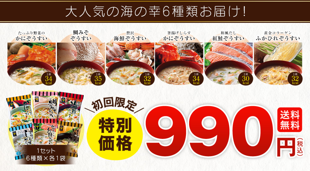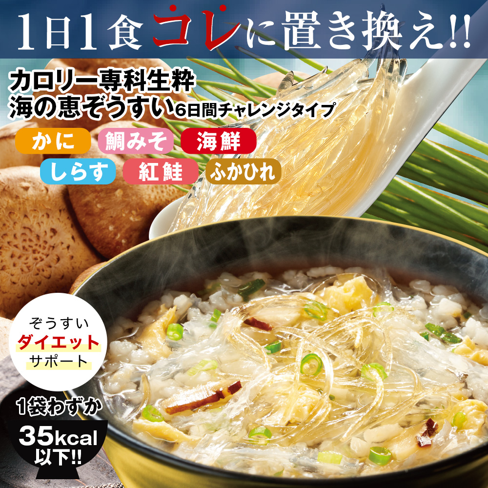 初回限定価格¥990(税込・送料無料)はカートに入れると反映されます。 初回限定特別価格の商品は1世帯につき1回限りのため、お届け先はご自宅のみとさせていただきます。 <ご購入に関するお願いとご注意> 「カロリー専科生粋海の恵ぞうすい6日間チャレンジタイプ」はご注文後1週間~10日前後で郵便ポストに投函いたします。 お届け日時の指定はできかねますので、ご了承ください。※ポストのサイズなどによって、投函出来ない場合は手渡しでのお届けとなります。他の商品と同時にご注文の場合は、弊社が指定する配送業者でお届けいたします。その場合、郵便ポストに投函でのお届けはできかねます。