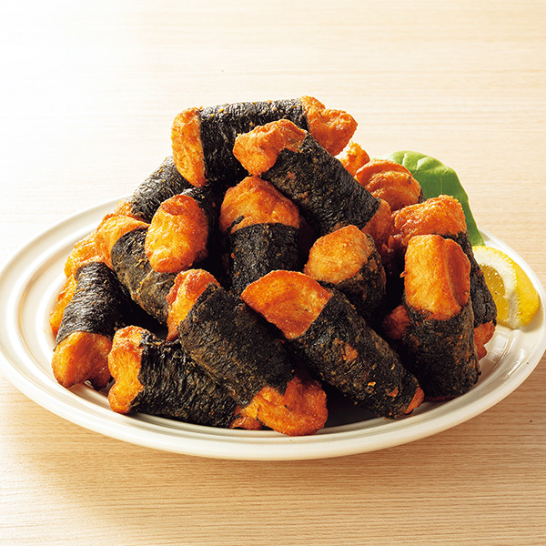 一口サイズで食べやすい! 新鮮な若鶏もも肉をスティック状にカットし、のりで巻いて仕上げました。のりの香りと鶏肉のジュシーさがやみつき間違いなし!