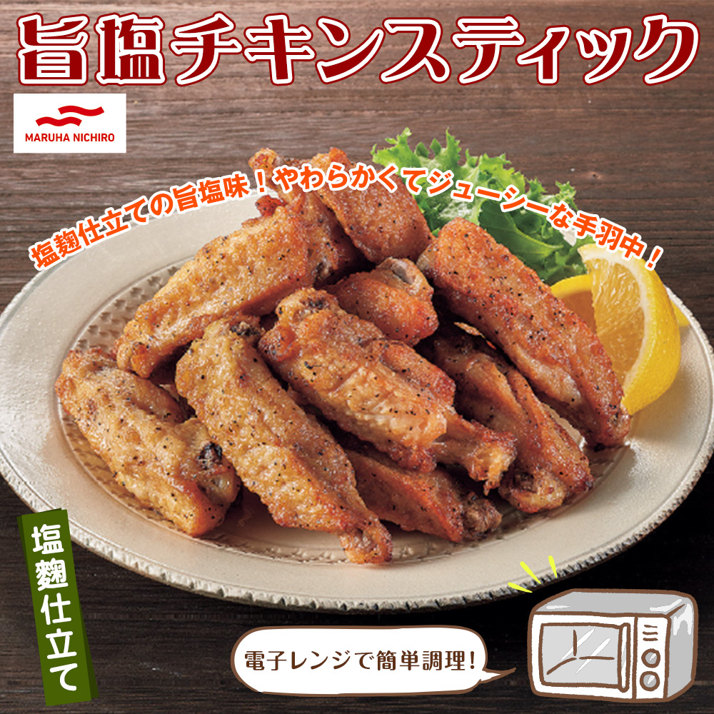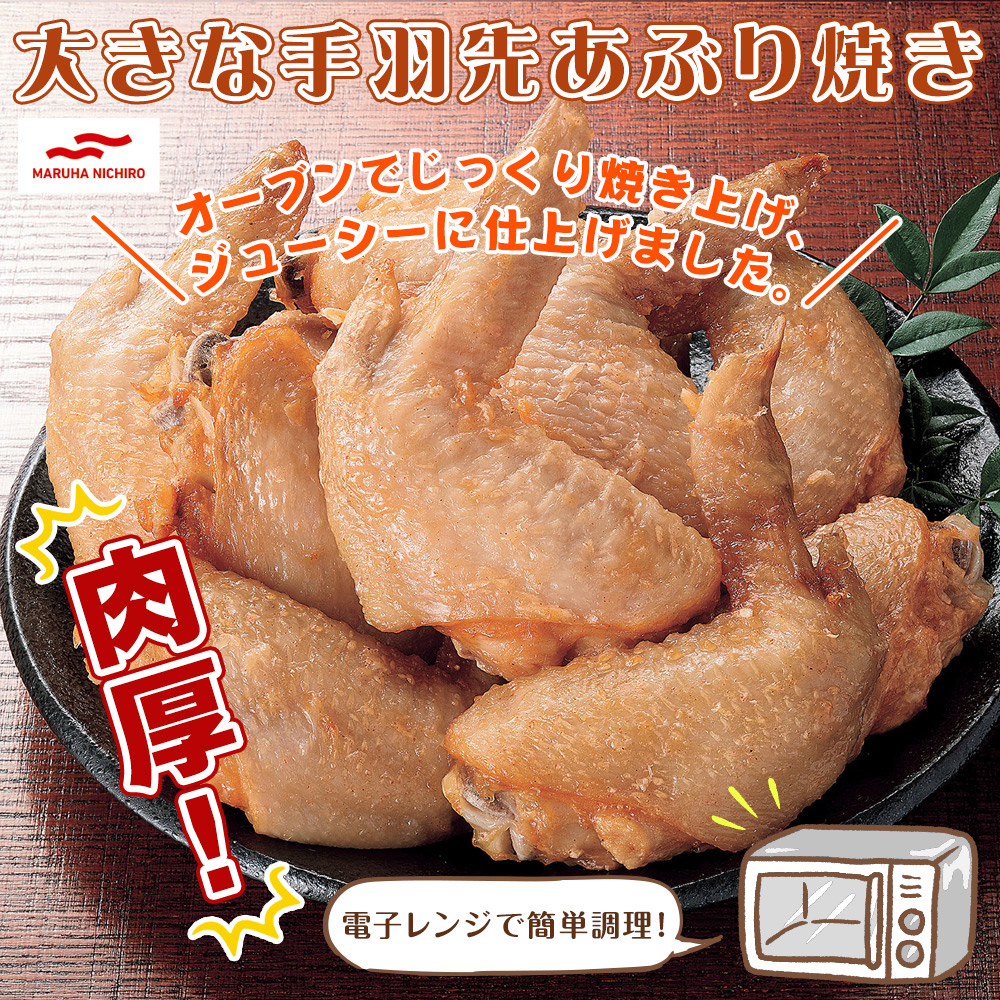 <旨塩チキンスティック> 塩麹、黒コショウで味付した手羽中ハーフを香ばしく焼き上げました。 1本食べるとクセになる旨塩味に仕上げています。 塩麹で漬け込んだ手羽中ハーフはやわらかくてジューシーな食感、 冷めてもやわらかいのでお弁当のおかずにもおススメです。 <大きな手羽先あぶり焼き> 大きな手羽先のみを厳選し、日本人好みの醤油・砂糖で味付した手羽先のあぶり焼きです。 ホットオーブンでじっくり焼き上げ、ジューシーに仕上げました。 手羽先に切れ込みを入れているので、中までしっかり味付されており、お肉が骨から取れやすく食べやすいです!