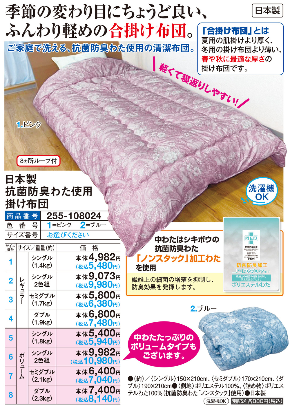 「合掛け布団」とは夏用の肌掛けより厚く、冬用の掛け布団より薄い、春や秋に最適な厚さの掛け布団です。
