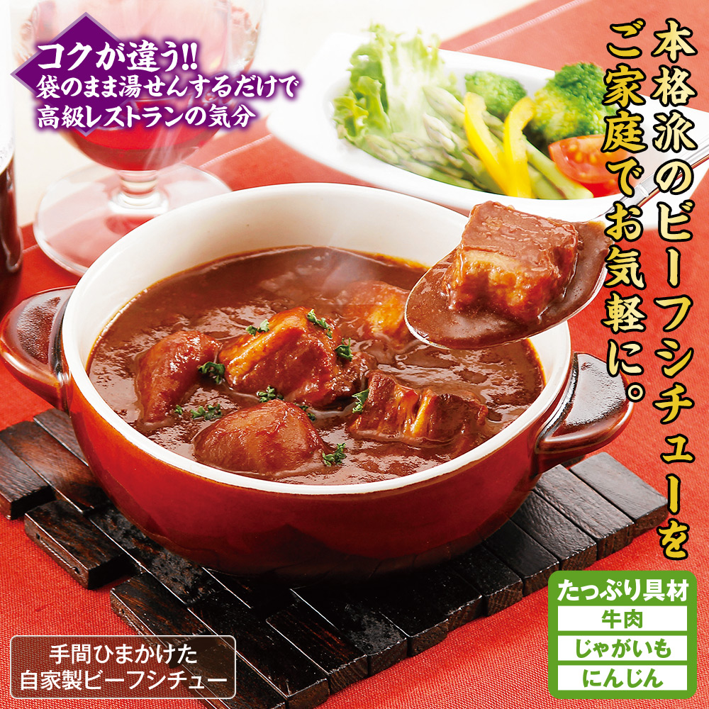 コクが違う!!袋のまま湯せんするだけで高級レストランの気分。 大きくカットした柔らかい牛肉と野菜を使い、こだわりの自家製デミグラスソースで風味豊かな味わいのシチューに仕上げました。 温めるだけの簡単調理で、食べ応えのあるお店の味が楽しめます。 手間ひまかけた自家製ビーフシチュー。 たっぷり具材 牛肉・じゃがいも・にんじん