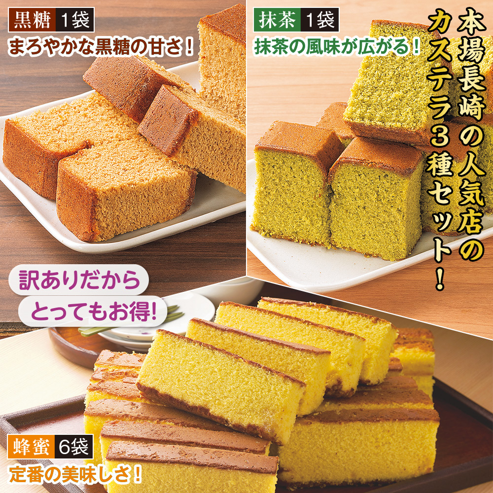 本場長崎の人気カステラ屋の味をお手頃価格で! カステラを成型する際にどうしてもできてしまう 切落しの部分を使った訳あり品だからリーズナブル♪ 定番の蜂蜜6袋に、抹茶と黒糖も1袋ずつセット 3種類の味わいをお楽しみ頂けます。