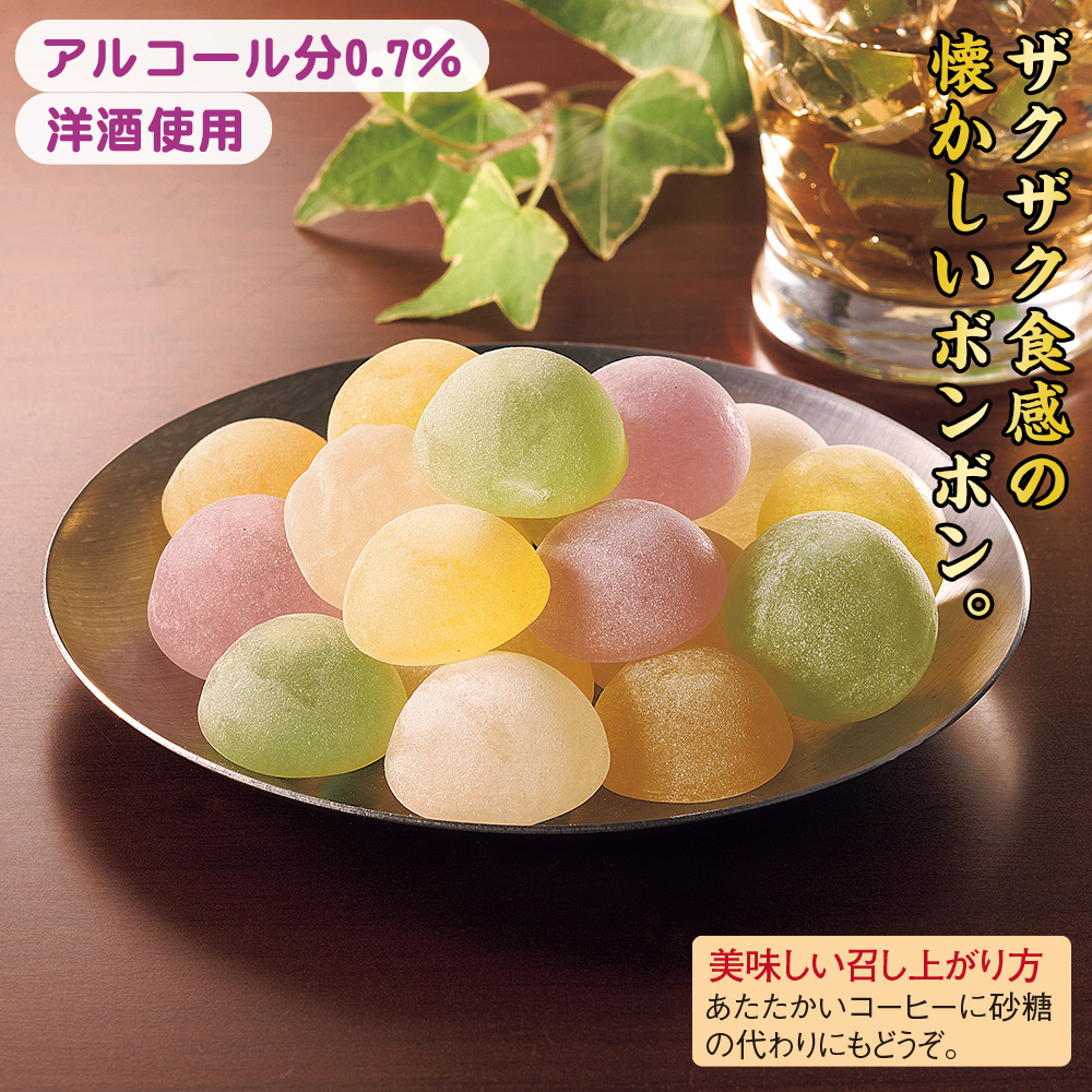 アルコール分0.7%洋酒使用。 昔懐かしいカラフルな色合いのお菓子。 手作りのウイスキーボンボンです。 美味しい召し上がり方 あたたかいコーヒーに砂糖の代わりにもどうぞ。