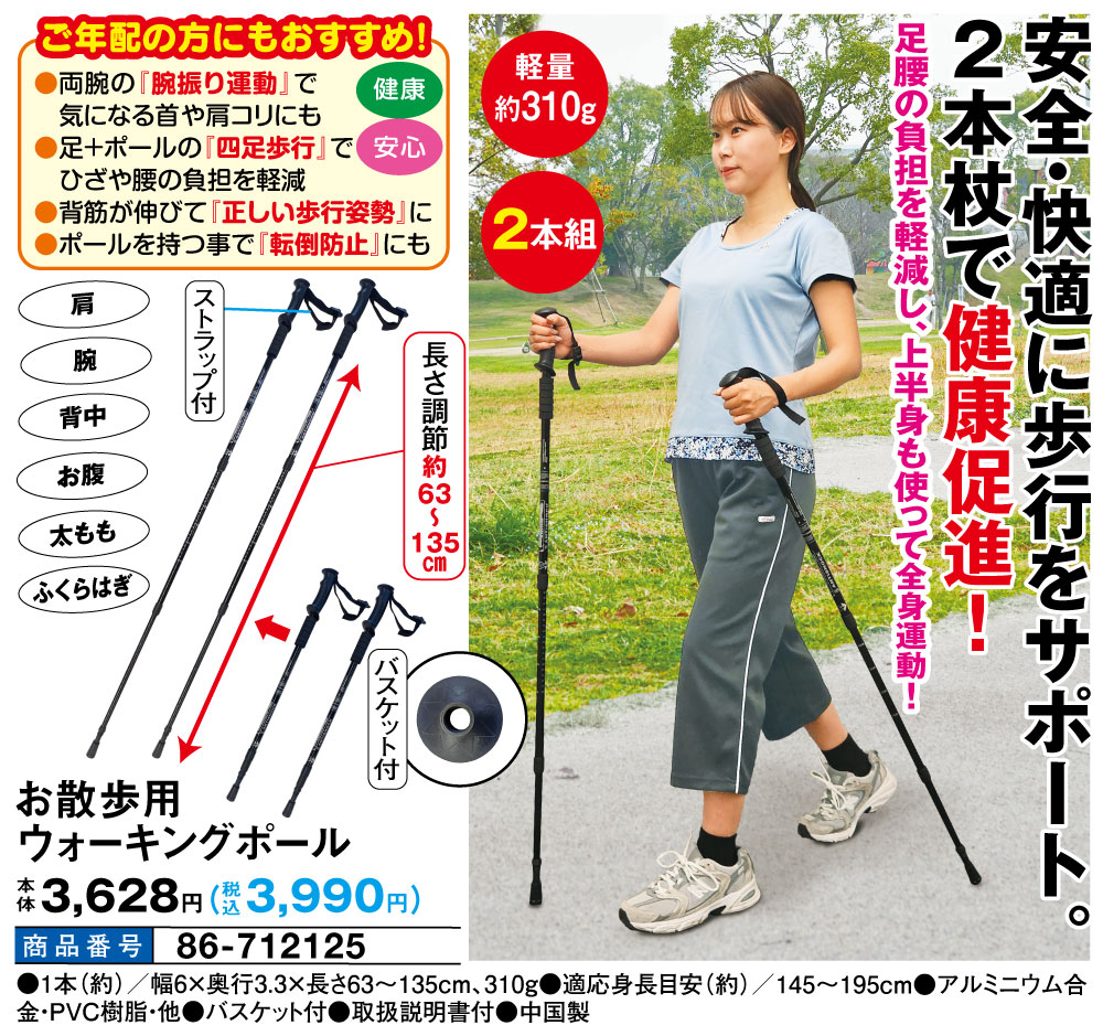2本杖で健康促進!安全・快適に歩行をサポート! 足腰の負担を軽減し、上半身も使って全身運動! 肩・腕・背中・お腹・太もも・ふくらはぎ ご年配の方にもおすすめ!! ●両腕の『腕振り運動』で気になる首や肩コリにも ●足+ポールの『四足歩行』でひざや腰の負担を軽減 ●背筋が伸びて『正しい歩行姿勢』に ●ポールを持つ事で『転倒防止』にも ・ストラップ付 ・バスケット付 ●軽量約310g ●2本組