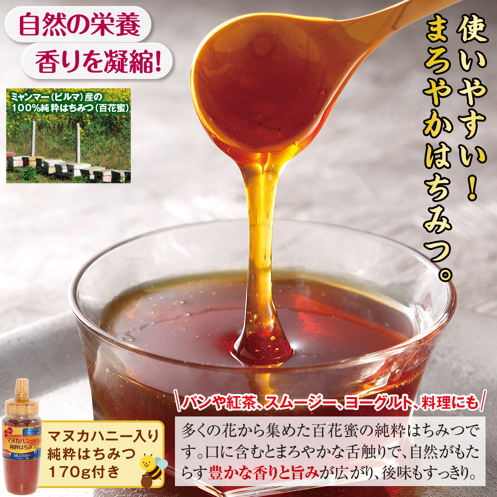 多くの花から集めた豊かな風味のミャンマー産の純粋はちみつです。 いつものお料理、パン、コーヒー、紅茶、ヨーグルト、フルーツ、黒酢、青汁などにご利用下さい。 マヌカハニー入りはちみつ170g付き