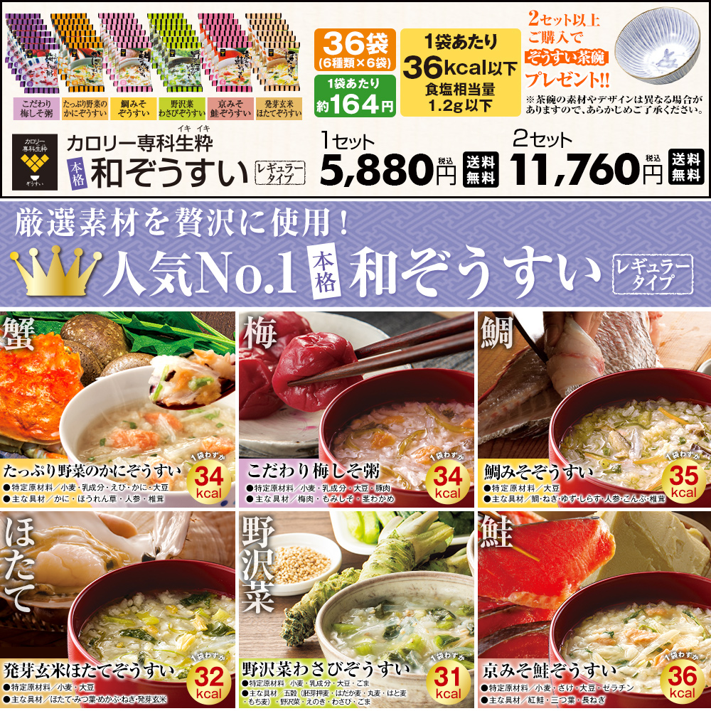 ●鯛みそぞうすい 鯛やしらすなど海の幸と白味噌がマッチ。上品なおいしさをご堪能ください。 (1袋/35kcal、食塩相当量:0.9g) ●野沢菜わさびぞうすい<五穀入り> ヘルシーな野沢菜と五穀の組み合わせ。わさびの風味が効いています。 (1袋/31kcal、食塩相当量:0.9g) ●発芽玄米ほたてぞうすい<みつ葉入り> 贅沢な海の幸、ほたての旨みがたっぷり。みつ葉も入って、香り豊かな味わいです。 (1袋/32kcal、食塩相当量:1.0g) ●京みそ鮭ぞうすい 上品な味わいの京みそと旨みたっぷり天然紅鮭を使って風味豊かに仕上げました。 (1袋/36kcal、食塩相当量:1.2g) ●こだわり梅しそ粥 紀州梅に国産もみしそ。味わい深いおいしさが、幅広い世代に好評です。 (1袋/34kca、食塩相当量:1.2gl) ●たっぷり野菜のかにぞうすい ずわいがにとたっぷりの野菜を使って、やさしい味わいに仕上げました。 (1袋/34kcal、食塩相当量:0.8g)
