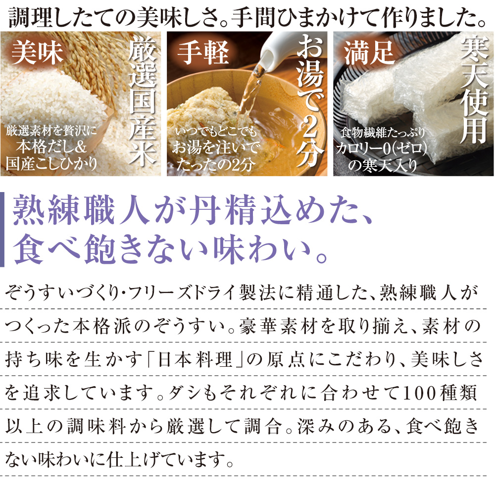 1袋あたり36kcal以下! 熟練の職人がつくった、飽きない本格和風の味。 ぞうすいづくり・フリーズドライ製法において、10年以上のキャリアがある熟練の職人がつくった本格和風の味。 素材の風味を重視する「日本料理」の考えのもと、味わい深く、食べ飽きない本格的な美味しさに仕上げました。 ○国内製造フリーズ食品