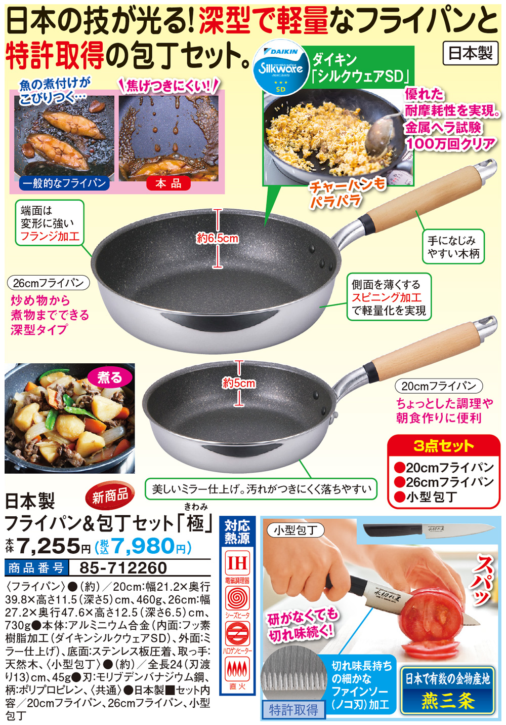 <フライパン> ●(約)/20cm:幅21.2×奥行39.8×高さ11.5(深さ5)cm、460g、26cm:幅27.2×奥行47.6×高さ12.5(深さ6.5)cm、730g ●本体:アルミニウム合金(内面:フッ素樹脂加工(ダイキンシルクウェアSD)、外面:ミラー仕上げ)、底面:ステンレス板圧着、取っ手:天然木 <小型包丁> ●(約)/全長24(刃渡り13)cm、45g ●刃:モリブデンバナジウム鋼、柄:ポリプロピレン <共通> ●日本製 ■セット内容/20cmフライパン、26cmフライパン、小型包丁