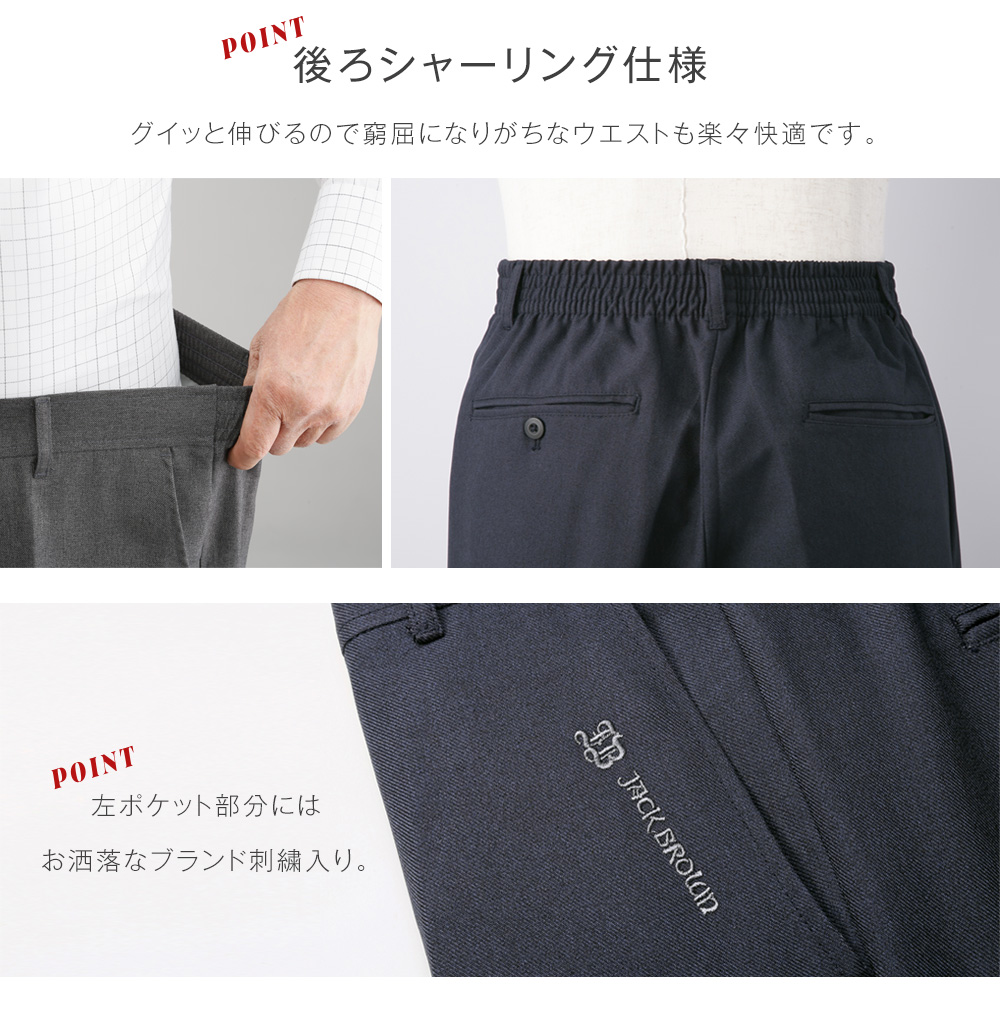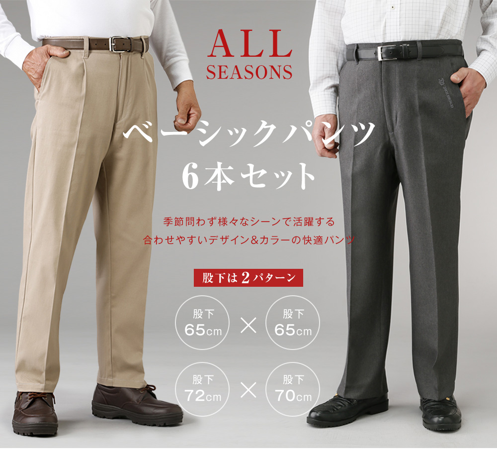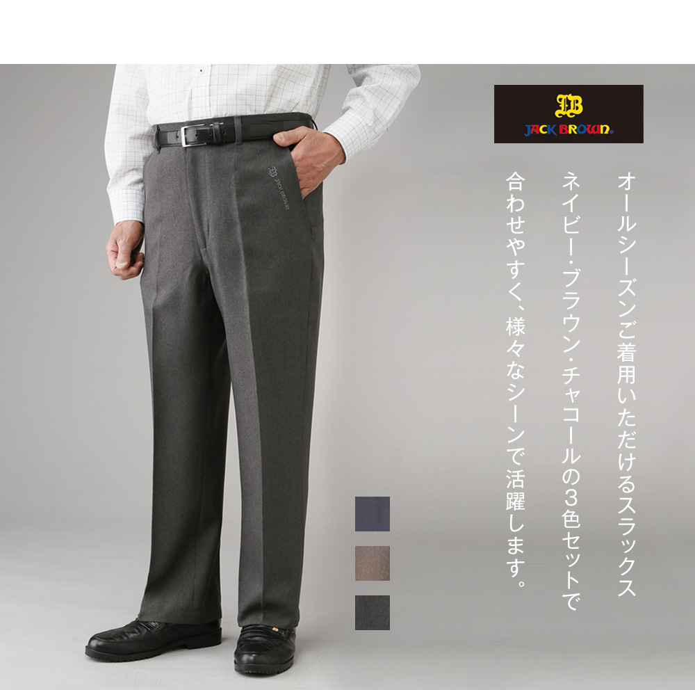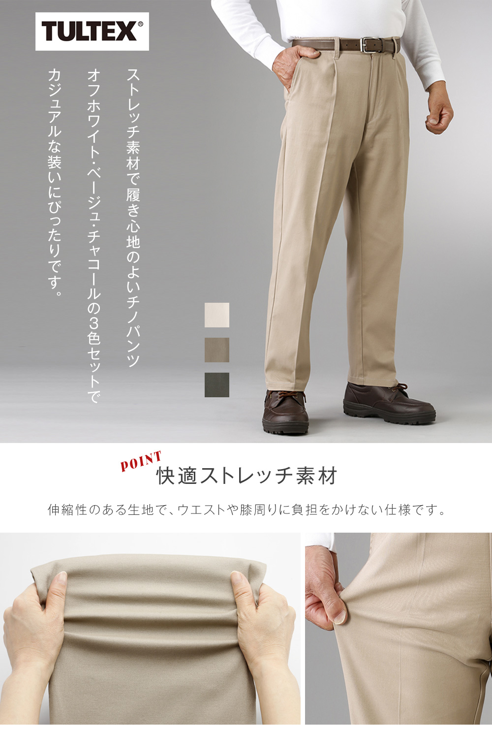 季節問わず使える、ストレッチ素材の履き心地よいパンツ 「TULTEX(タルテックス)」「JACK BROWN(ジャック ブラウン)」 2つのブランドからそれぞれチノパンツとスラックスを3本ずつ合わせた 数量限定のお買得定番パンツ6本セット! 各ブランド 同サイズ3色組です。 「TULTEX(タルテックス)」 ⇒オフホワイト・ベージュ・チャコール 「JACK BROWN(ジャック ブラウン)」 ⇒ネイビー・ブラウン・チャコール シャーリング仕様で気になるお腹周りもラクラク! コーディネイトしやすいカラーバリエーションで、様々なシーンで活躍! 裾上げ済みなのでご購入後すぐにご着用いただけます。