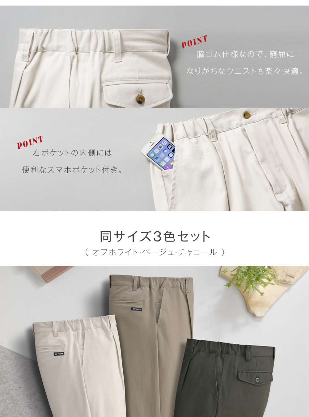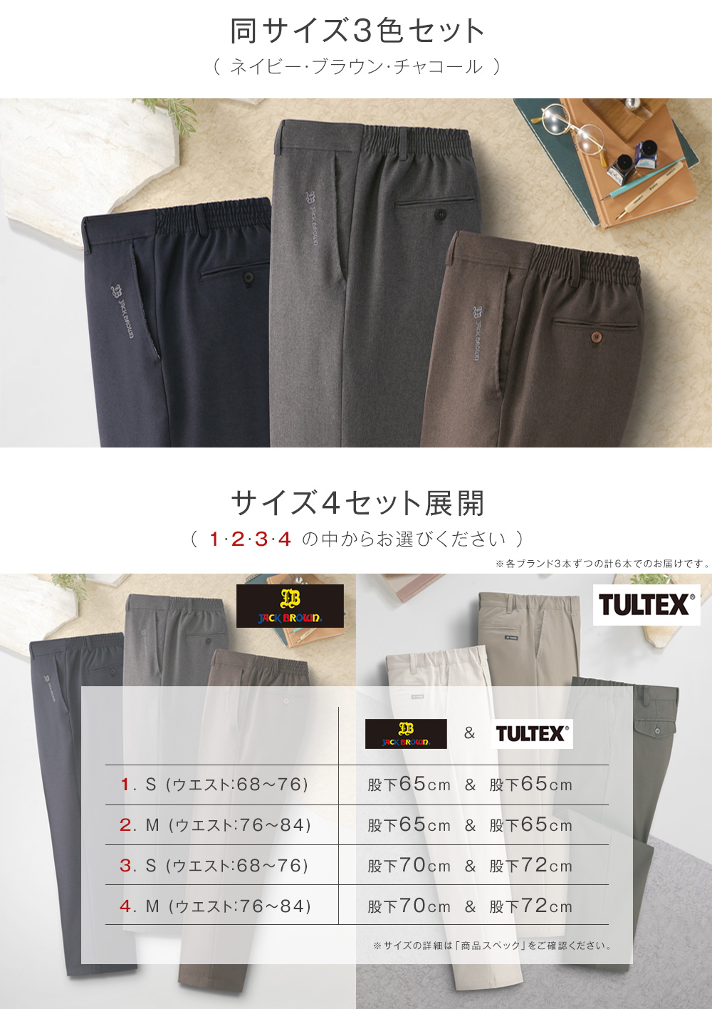 ≪TULTEX タルテックス≫ 【サイズ(約)】 適応胴囲、股上、裾幅 <S>(68~76)cm、22.5cm、20cm <M>(76~84)cm、24cm、20.5cm ■綿98%・ポリウレタン2% ◆左右ポケット3(右内側にスマホポケット)、左右後ポケット2、ウエスト脇ゴム(片側+6cm)、前あきファスナー ◆ワンタック ◆オフホワイト・ベージュ・チャコールグレーの同サイズ3色組 ◆中国製 ≪JACK BROWN ジャックブラウン≫ 【サイズ(約)】 適応胴囲、股上、裾幅 <S>(68~76)cm、26cm、21cm <M>(76~84)cm、28cm、22cm ■ポリエステル100% ◆左右ポケット2、左右後ポケット2、ウエスト後シャーリング、前あきファスナー ◆ノータック ◆ネイビー・ブラウン・チャコールグレーの同サイズ3色組 ◆中国製
