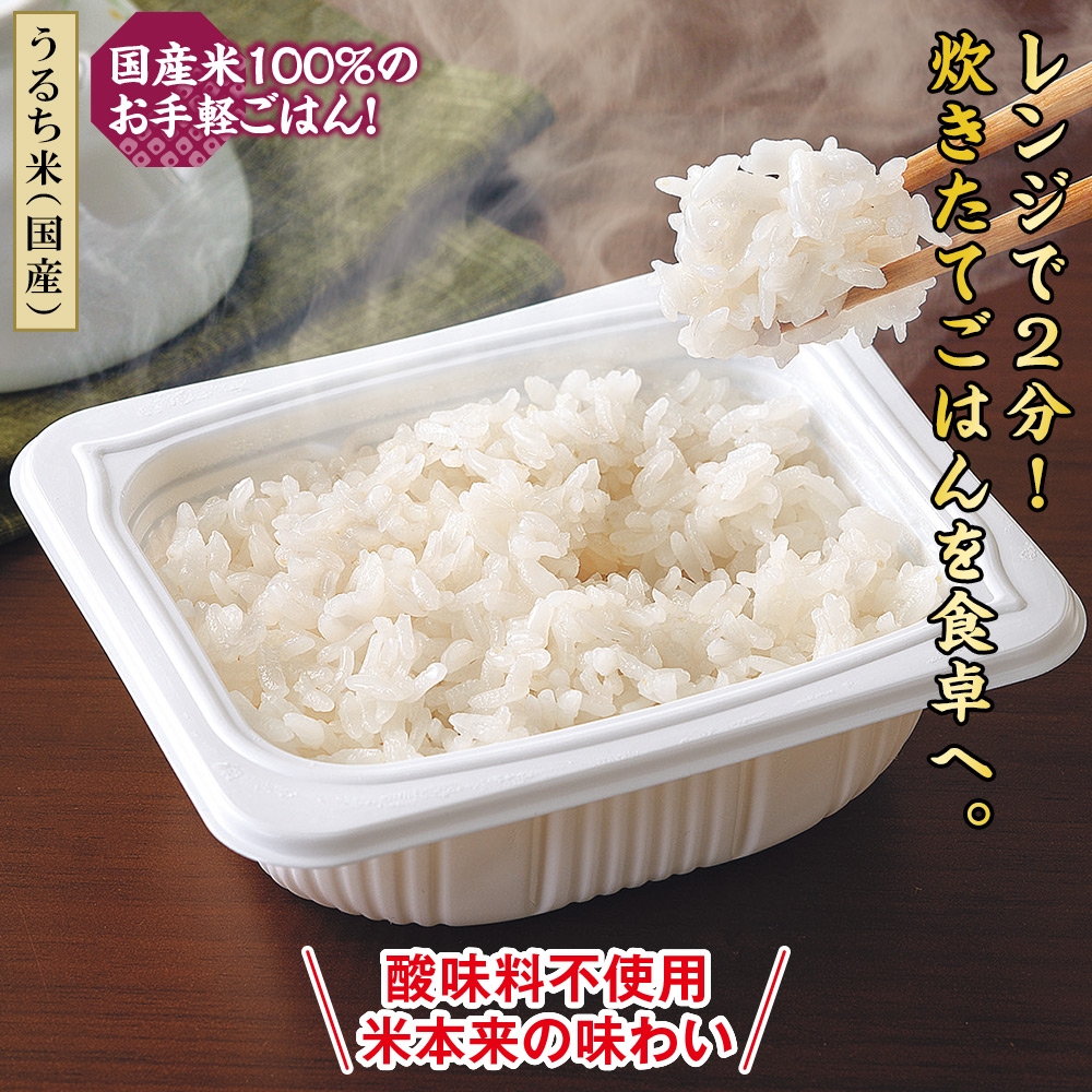【うるち米(国産)】 国産米100%のお手軽ごはん! 酸味料不使用米本来の味わい。 低温で精米したお米をそのまま「パックごはん」にしました。 お米本来の味と香りが楽しめます。