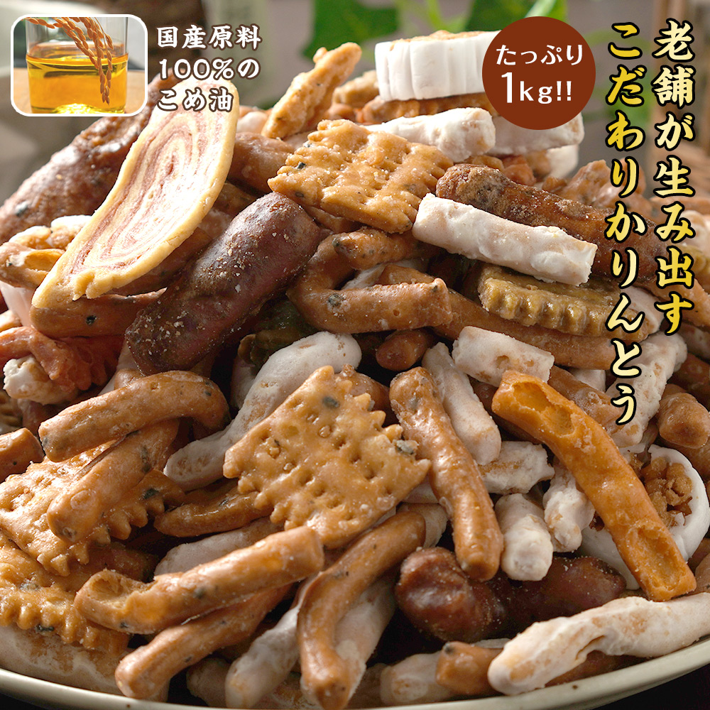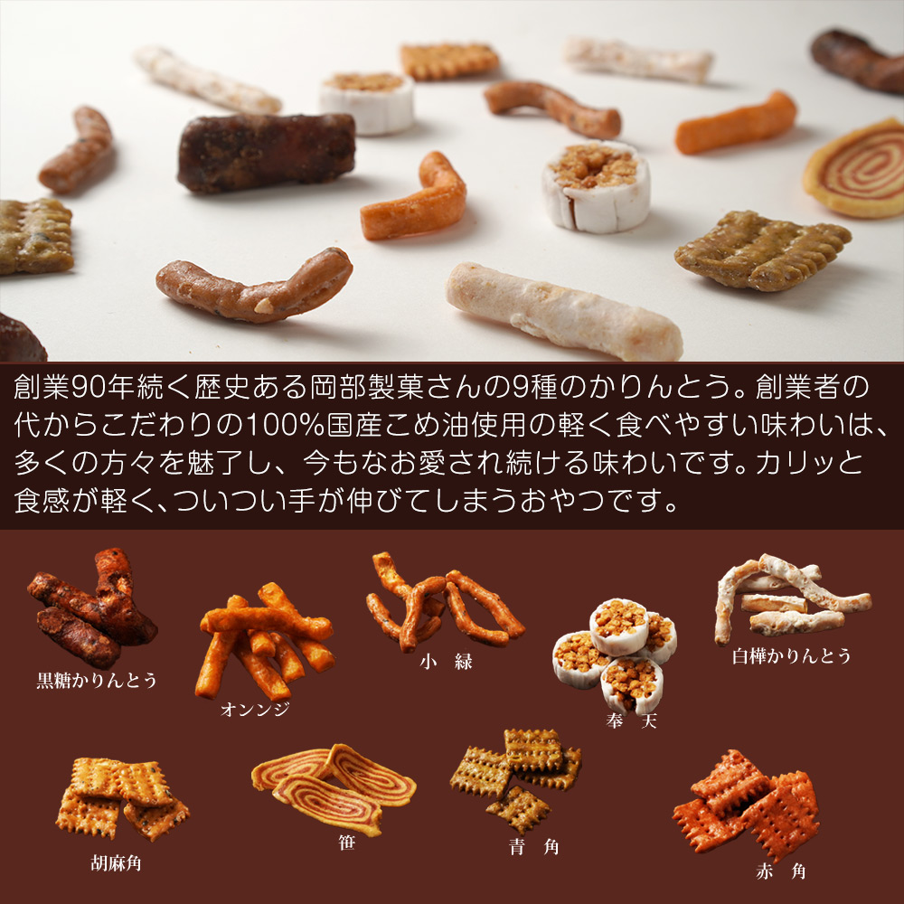 創業90年続く歴史ある岡部製菓さんの9種のかりんとう。 創業者の代からこだわりの100%国産こめ油使用の軽く食べやすい味わいは、多くの方々を魅了し、今もなお愛され続ける味わいです。 カリッと食感が軽く、ついつい手が伸びてしまうおやつです。